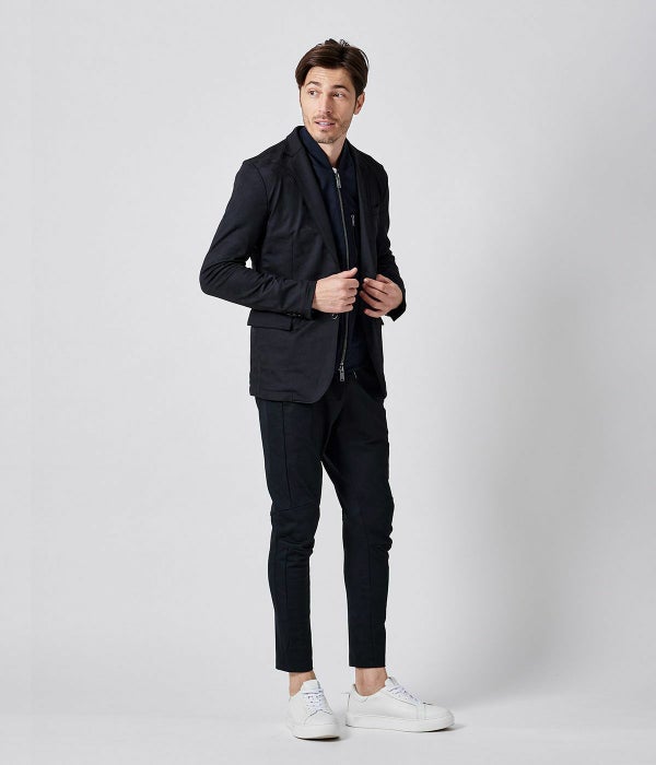 スポーツ系のトラックジャケットやパンツに用いられるような伸縮性のあるキメの細かいジャージー素材を使用。