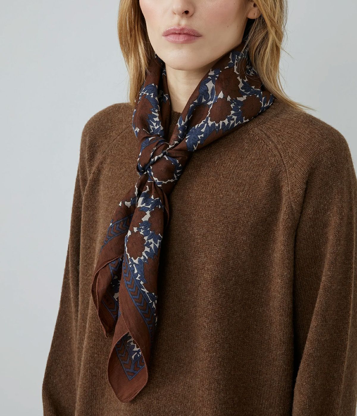 モワモンのワードローブに欠かせないタイムレスな存在、「アンバー スカーフ N°680」は、シーズンごとに新たなカラーで登場します。100%コットンを使用し、爽やかで軽やかな印象をもたらす繊細なフローラルプリントが魅力です。 90×90cmの大きめサイズは、多彩なスタイリングを可能にし、ヘリンボーンのボーダーと控えめな Moismont ロゴの刺繍が、上品で洗練されたアクセントを添えています。 多用途で光沢感のあるこのスカーフは、コーディネートに柔らかな彩りとエレガントな雰囲気をプラスする理想的なアクセサリーです。