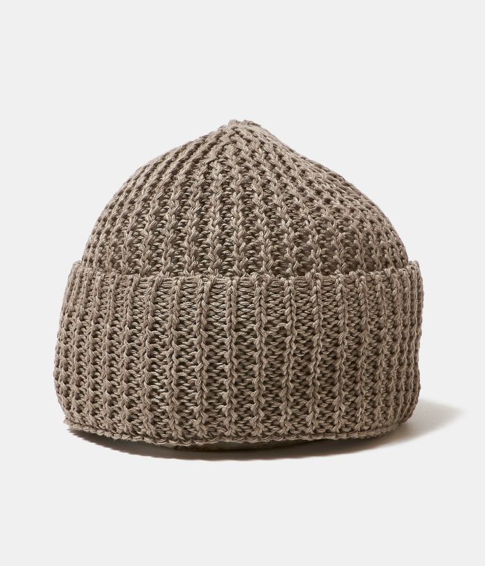 リネンとシルクの混紡素材を使用したニットキャップ。 リネンの持つサラッとした手触りや通気性に加え、シルク特有のソフトな肌あたりと、とろみのあるマットな光沢感を兼ね備えています。 ローゲージのざっくりとした編み地のタイプで通気性にも優れているため、夏場にも活躍します。 ベーシックでユニセックスなデザインのため、女性にも男性にもおすすめです。