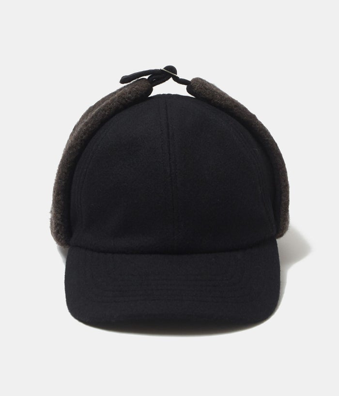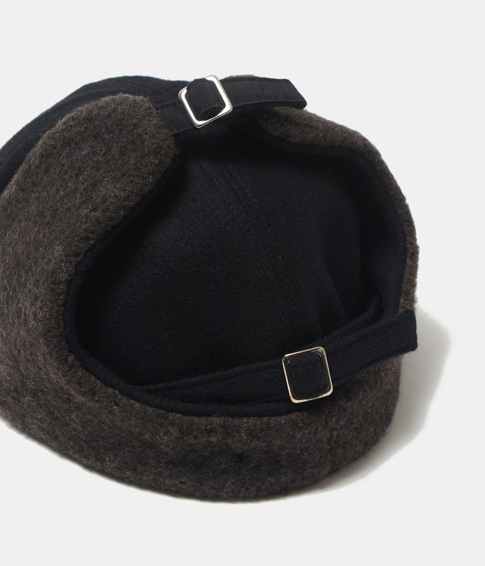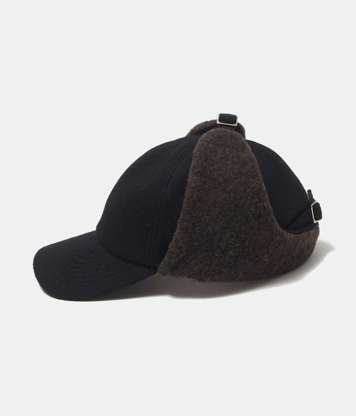 冬専用キャップ。リサイクルウール×リサイクルナイロン素材を使用した耳のフラップ付きの6パネルキャップになります。 防寒としてフラップをバックルから外せば耳当てとしてご利用頂けます。 ブラックにブラウンという秋冬らしい配色もポイント。