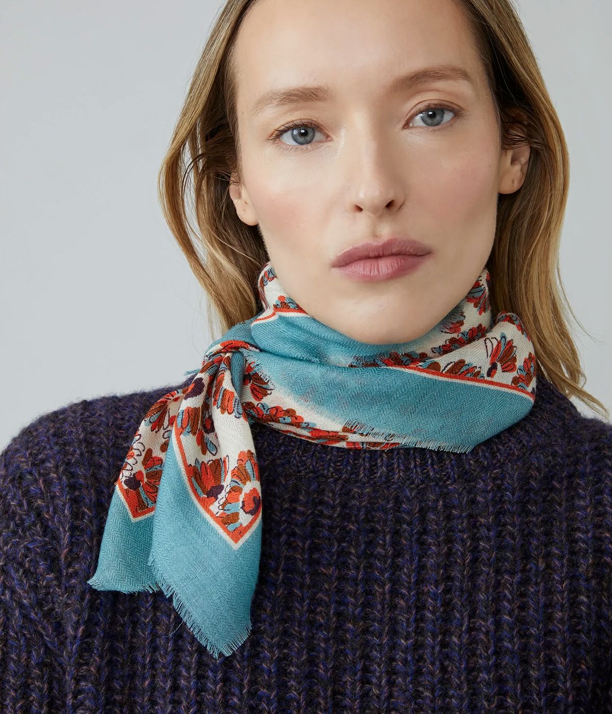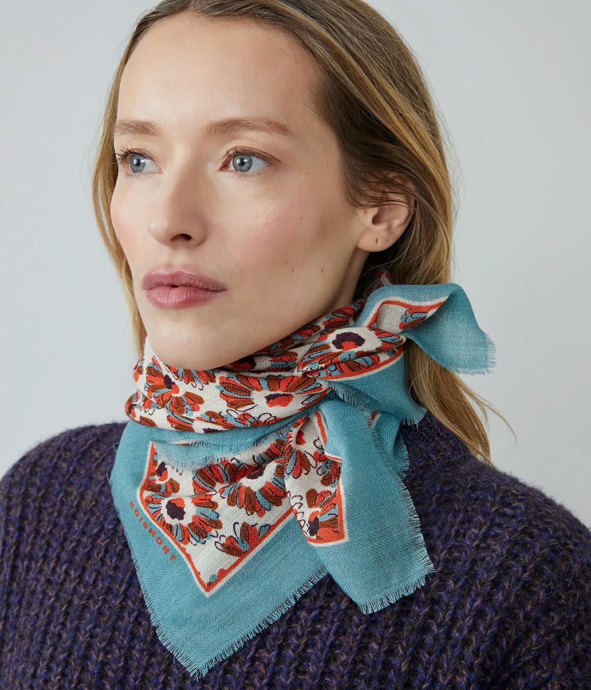 「クロイドン スカーフ No.794」は、英国プリントの優雅さから着想を得て、リバティ・スピリットを新鮮かつモダンに再解釈した一枚です。柔らかく軽やかなウールを、インドの職人が丁寧に手織りで仕立てました。70×70cmの使いやすいサイズは、首元にも髪にもぴったり。