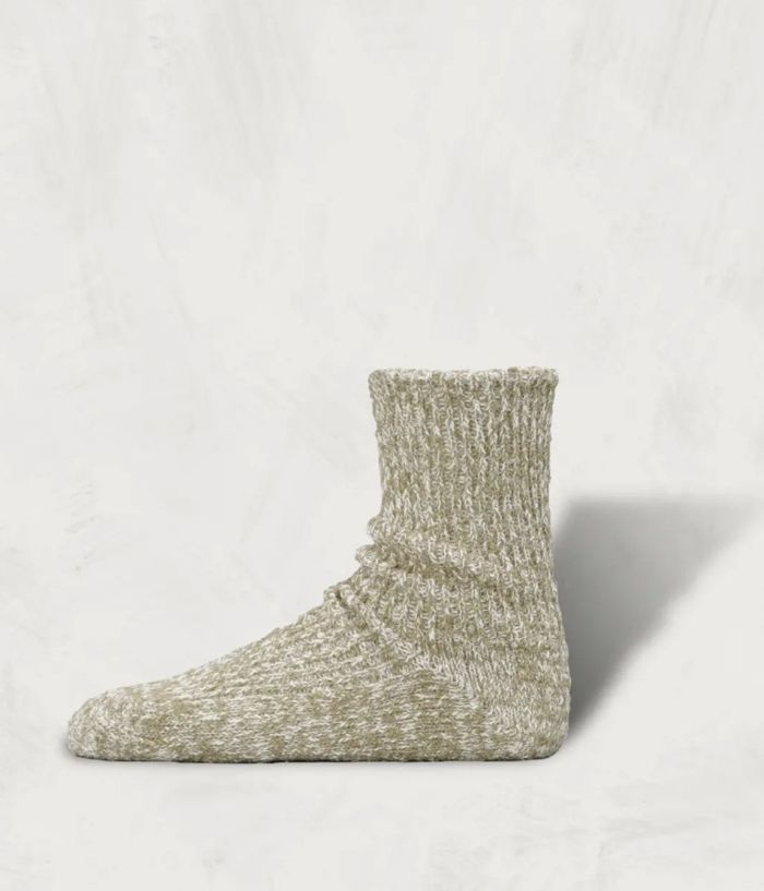 あまり靴下で用いられることのない、強い特徴を持つ個性的な2種類の糸を引き揃えて編むことで、独特な印象のデザインに仕上げた。