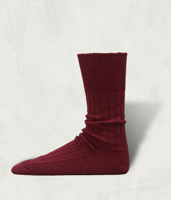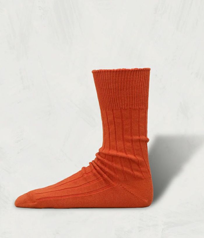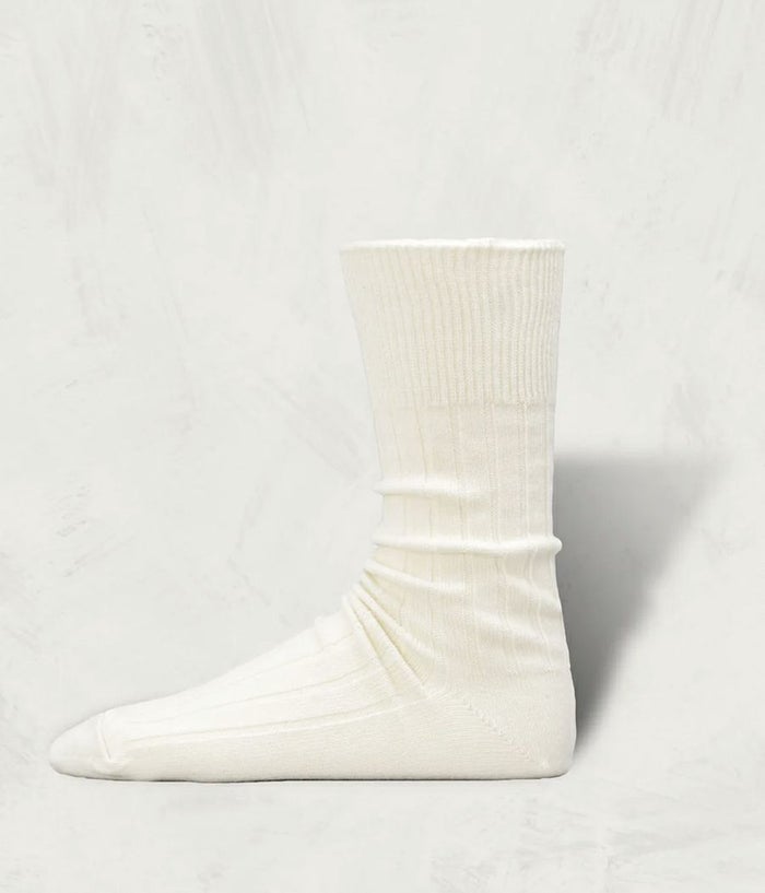 カシミヤとコットンの混紡糸で編みたてた。カシミヤの質感を持ちながら、 耐久性をコットンが補完するバランスの整った素材のリブソックス。
