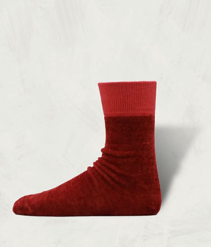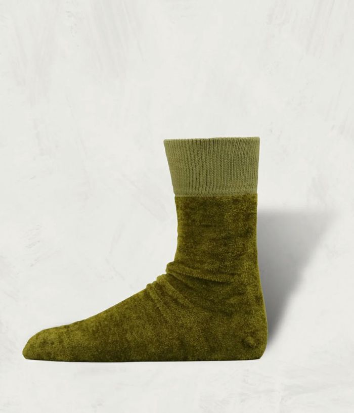 糸の脱落が少ない特殊なモール糸で、高級感のあるベロアの様な風合いに編みたてた靴下。