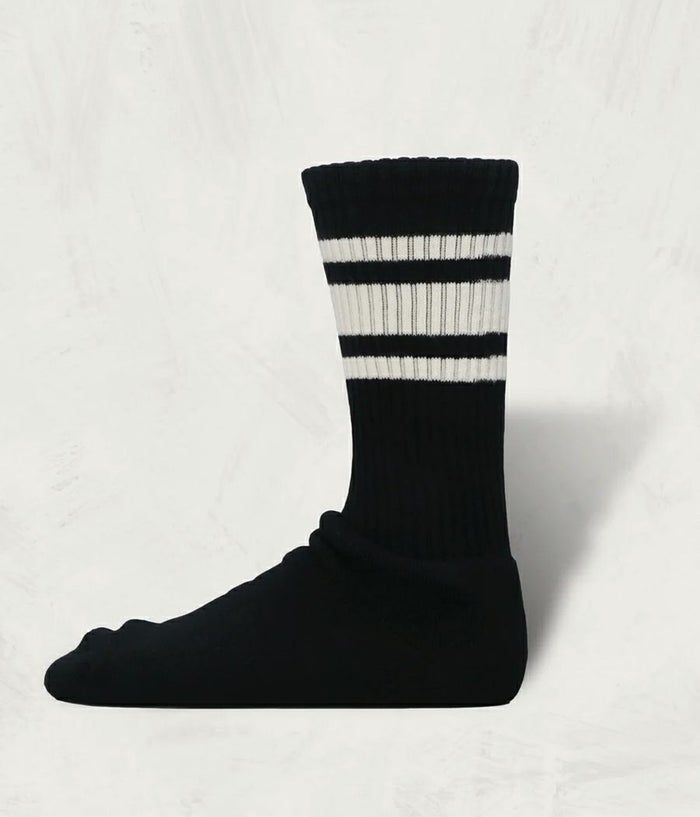 スケーターが一つのカルチャーとして成熟した80年代。70年代に主流だった19インチのハイソックスに変わり普及していったミドル丈のスケーターソックスをショート丈に作り替えた。80年代の西海岸の雰囲気に足された品質が程よい違和感を演出している。