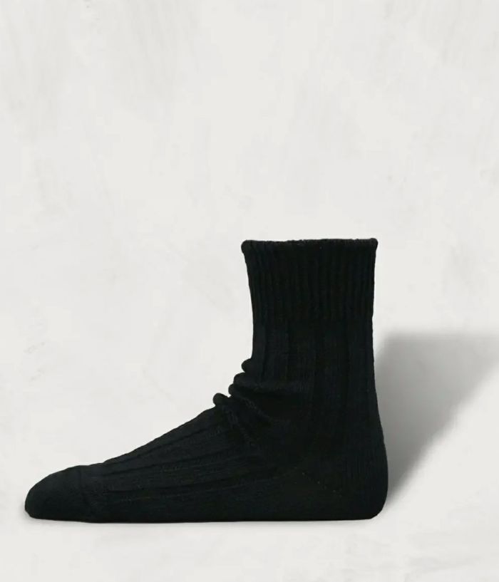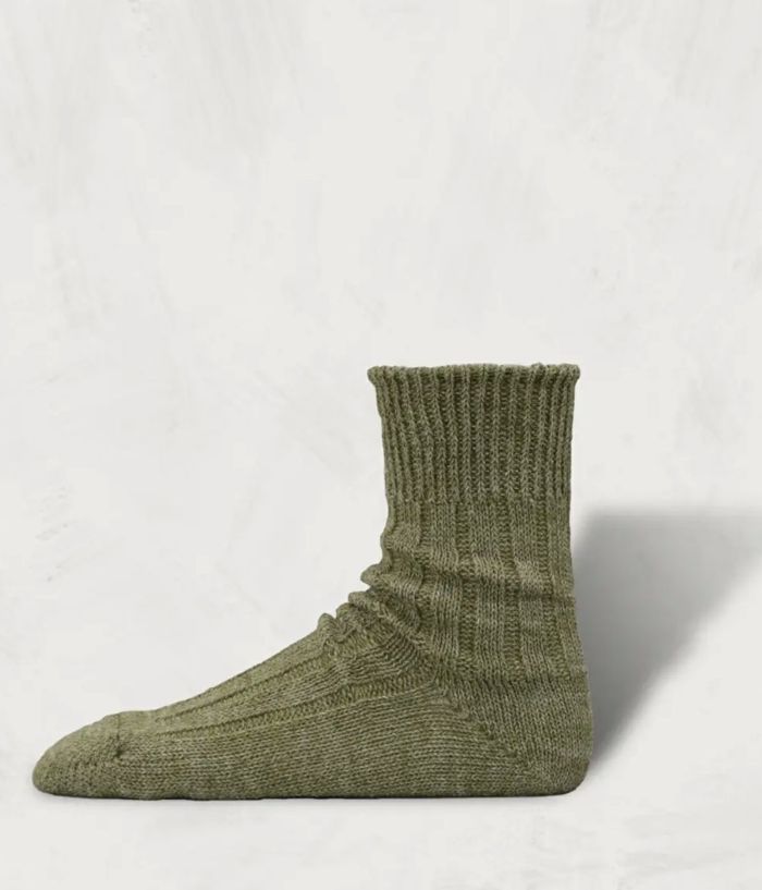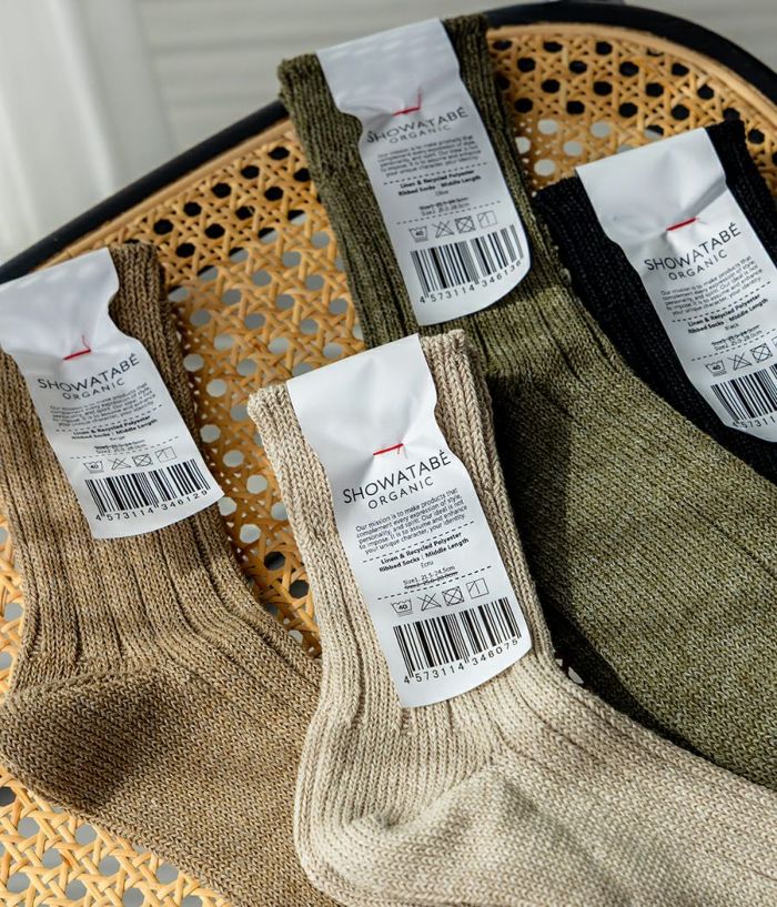 ヨーロッパのリネンに再生ポリエステルを混紡した糸で編み立てた。リサイクルという表面的な概念だけではなく、異なる素材が相互的にデメリットを補完し合っているという美しさを持った靴下。