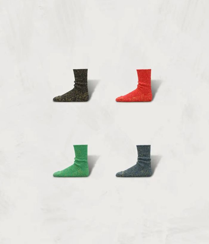 クラシックなリブコットンベースに、極端な発色するゴールドのラメ糸を編み込んだローゲージのリブソックス。
