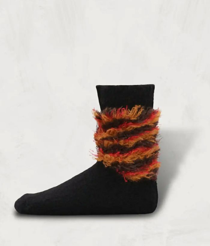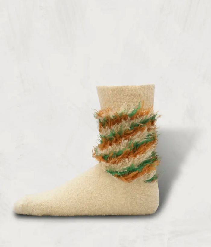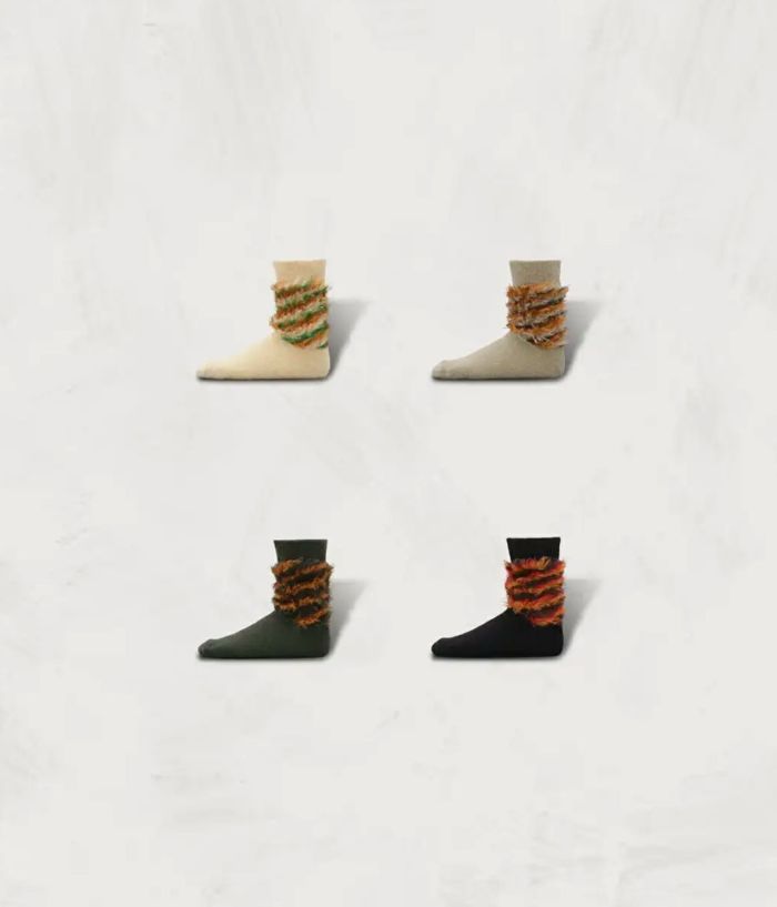 スパイラル状に編み込んだ柄糸を裏で切断し、裏表で仕上げることで、独特なファーのようなデザインを生み出した。素材にはタム糸を使用し、わずかにテクスチャーを出すことで表情に変化を加えた。