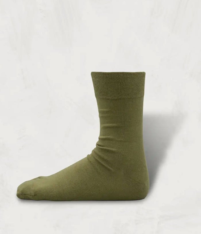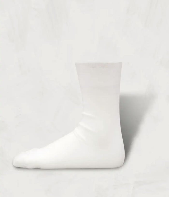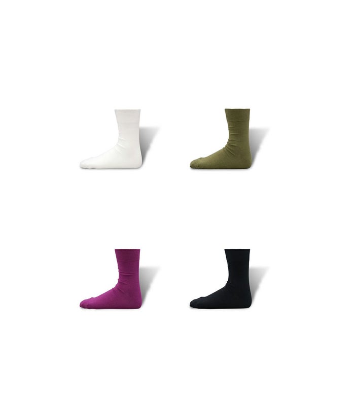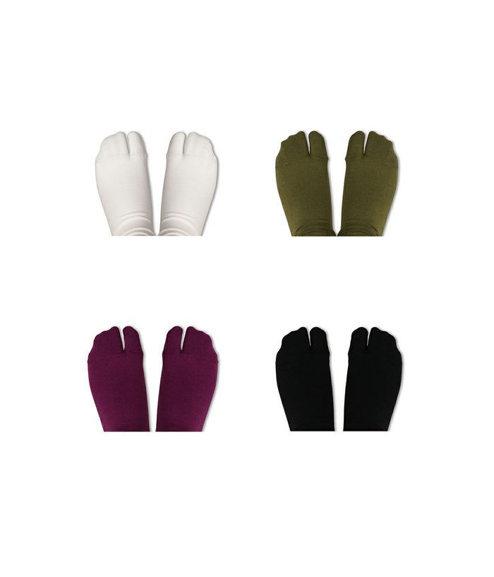 シンプルなデザインのタビ型の靴下をコットンでハイゲージに編み立てた。