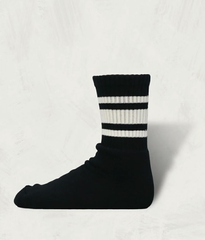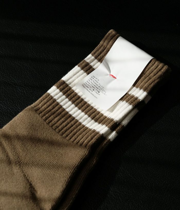 スケーターが一つのカルチャーとして成熟した80年代。70年代に主流だった19インチのハイソックスに変わり普及していったミドル丈のスケーターソックスをショート丈に作り替えた。80年代の西海岸の雰囲気に足された品質が程よい違和感を演出している。