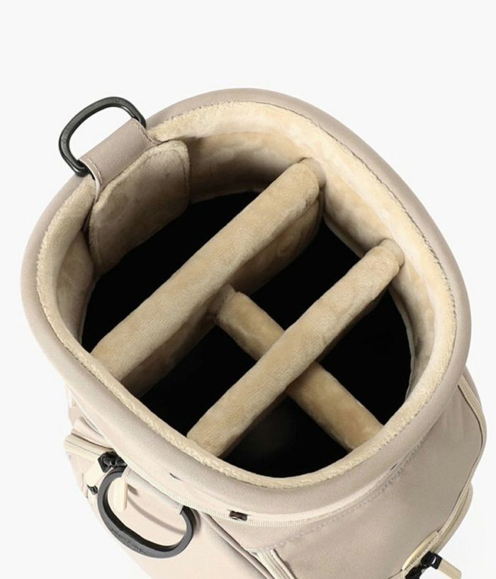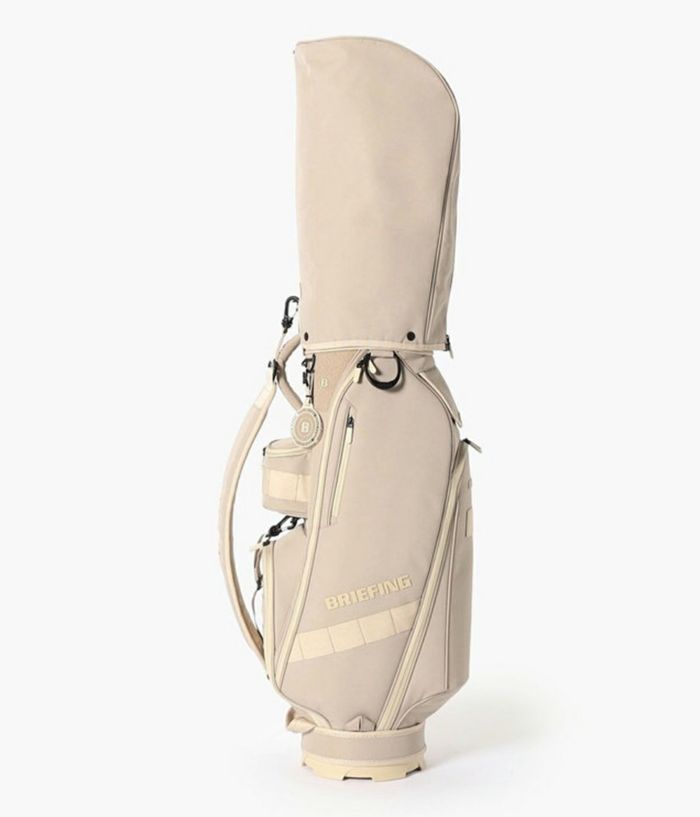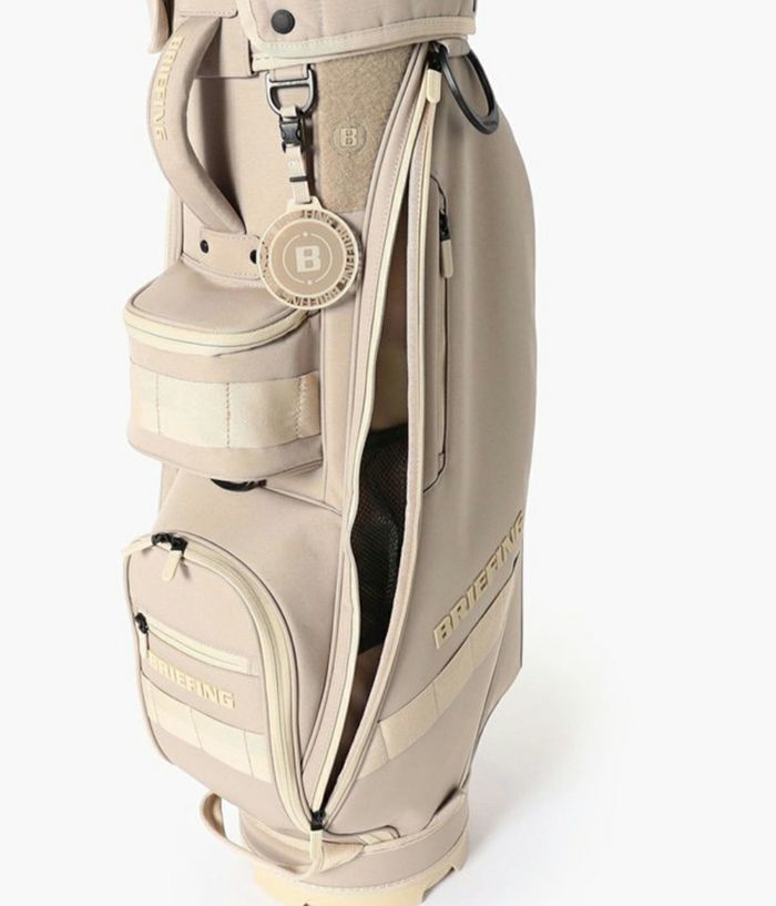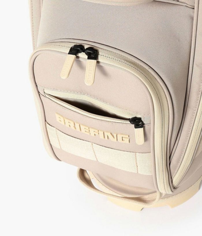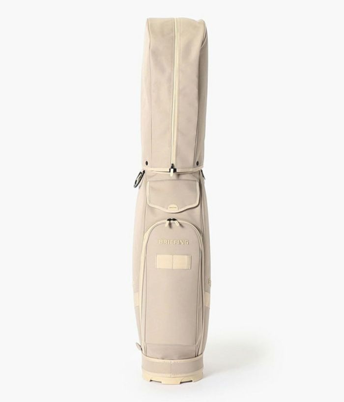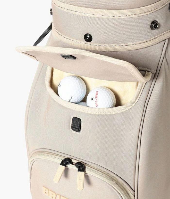 -多彩な収納- ・大小あわせて13個のポケットを装備。 ・両サイドにアウターやフードを収納しやすい大型ジップポケットを配置。 ・内装には仕切りポケットを設け、整理しやすい設計。 ・フロント上段にティーやボール用の立体ポケット、下段にゴルフボール1ダースが収まるポケットを完備。 ・各収納部にYKK製WATER-R(撥水仕様)ファスナーを採用。 ・口枠は8.5型のコンパクト設計ながら、ウッド用スペースを広く確保し、出し入れをスムーズに。 -洗練されたニュートラルカラー- ・ロゴは射出成型TPUで立体的に表現。 ・ワントーンで統一しながらも奥行きを感じさせる仕上がり。 ・底面に成型ロゴ入りオリジナルパーツを採用。 ・本体と調和する丸型ネームプレートが付属。 -環境配慮と機能性を両立する素材- ・RPET(再生ポリエステル)を使用した高密度オリジナルファブリック。 ・シャリ感のあるドライな風合いと奥行きのある発色。 ・高密度織りによる耐久性と撥水加工で雨天時にも対応。
