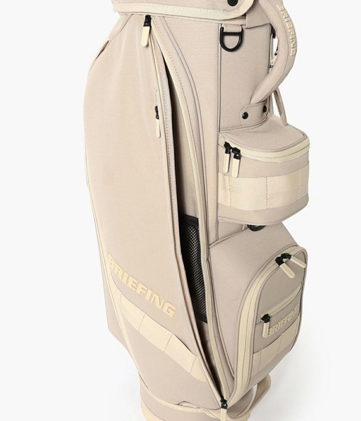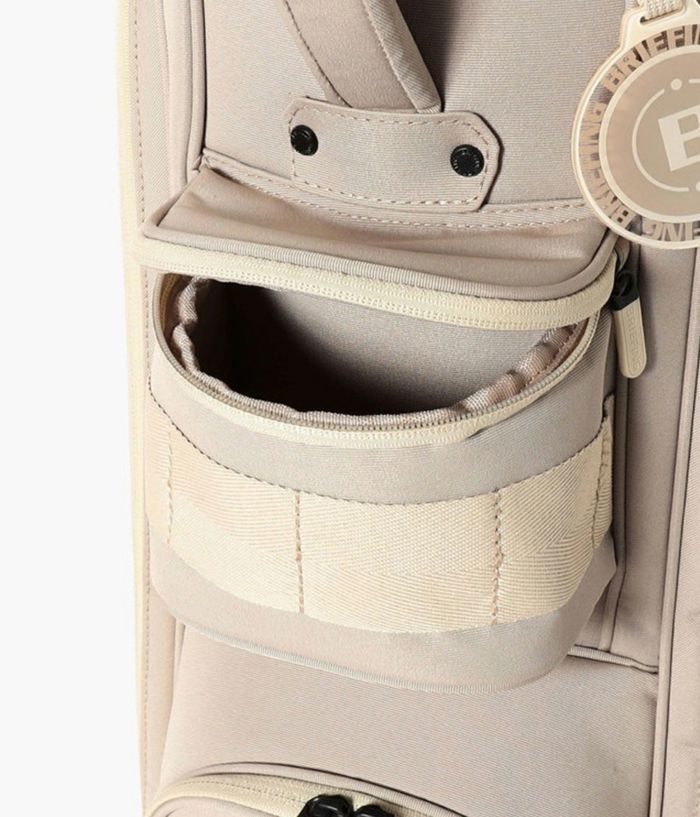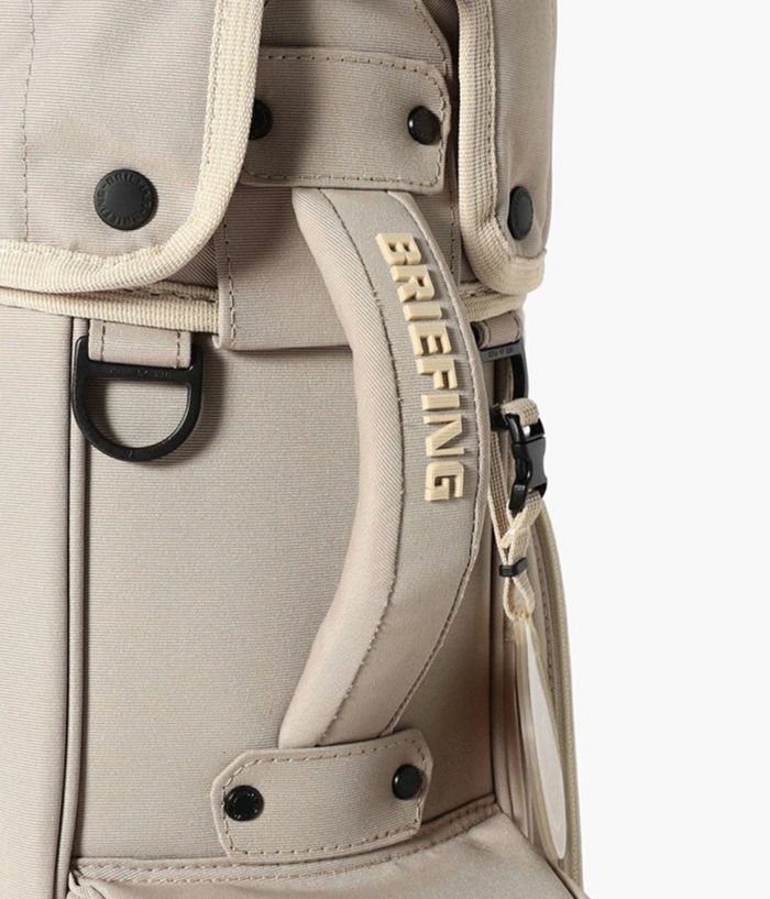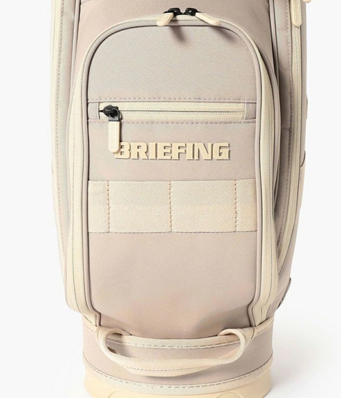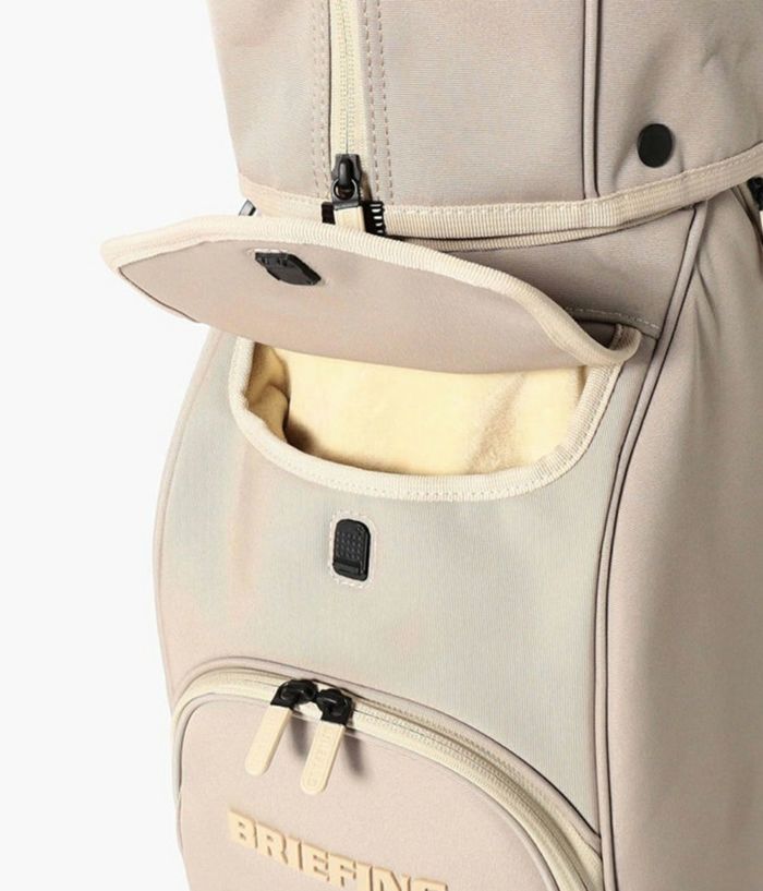 -多彩な収納- ・大小あわせて13個のポケットを装備。 ・両サイドにアウターやフードを収納しやすい大型ジップポケットを配置。 ・内装には仕切りポケットを設け、整理しやすい設計。 ・フロント上段にティーやボール用の立体ポケット、下段にゴルフボール1ダースが収まるポケットを完備。 ・各収納部にYKK製WATER-R(撥水仕様)ファスナーを採用。 ・口枠は8.5型のコンパクト設計ながら、ウッド用スペースを広く確保し、出し入れをスムーズに。 -洗練されたニュートラルカラー- ・ロゴは射出成型TPUで立体的に表現。 ・ワントーンで統一しながらも奥行きを感じさせる仕上がり。 ・底面に成型ロゴ入りオリジナルパーツを採用。 ・本体と調和する丸型ネームプレートが付属。 -環境配慮と機能性を両立する素材- ・RPET(再生ポリエステル)を使用した高密度オリジナルファブリック。 ・シャリ感のあるドライな風合いと奥行きのある発色。 ・高密度織りによる耐久性と撥水加工で雨天時にも対応。