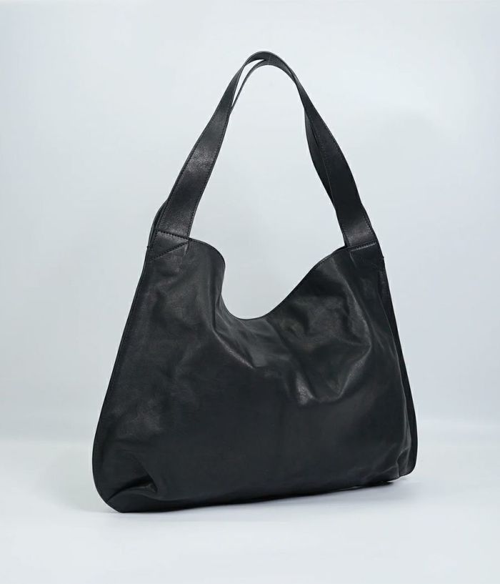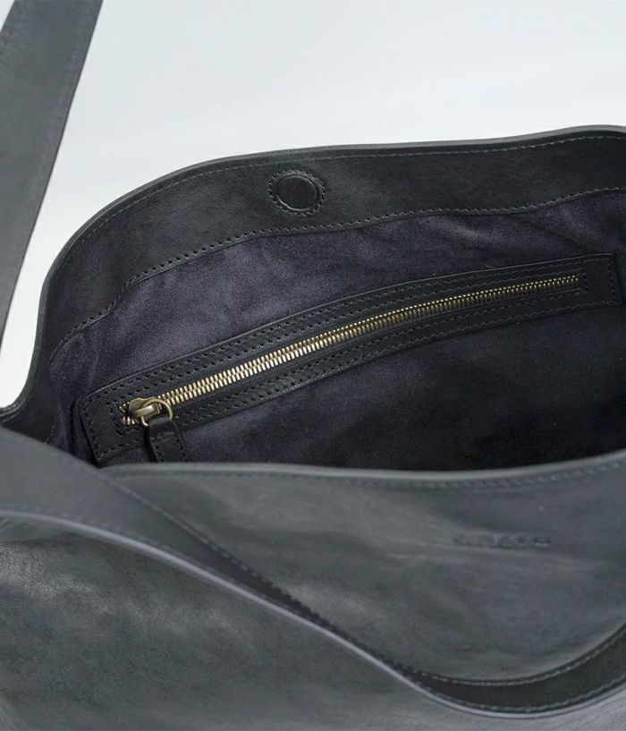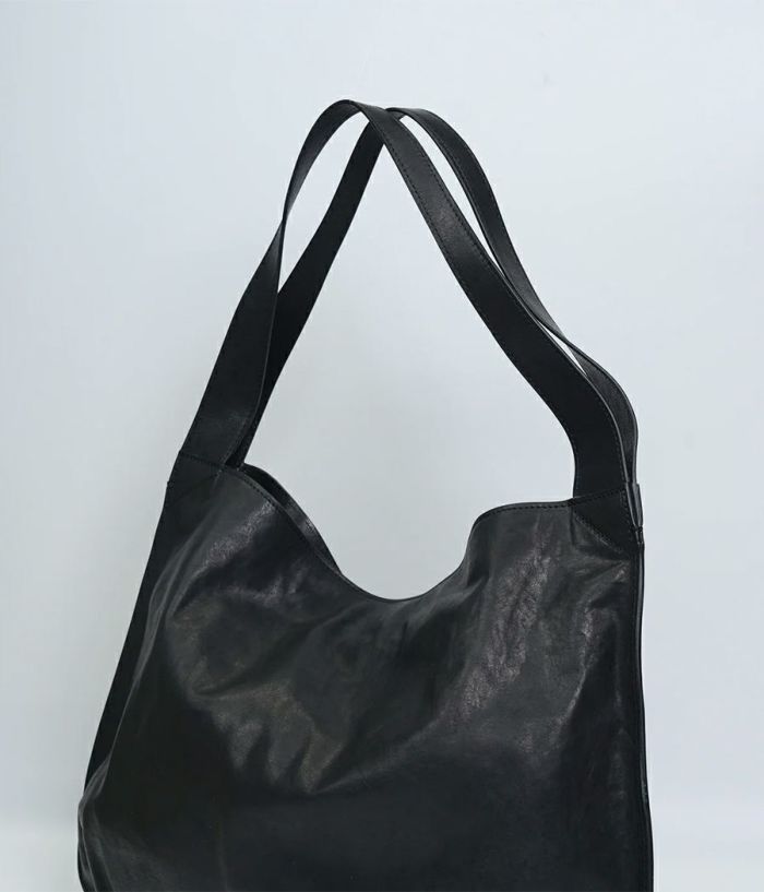 革の素材を最大限引き出した大振りな革袋。ざっくりとした作りにも内装に仕切りポケットが二つ、ファスナーポケットを装備し小物を仕分けして収納が可能。持った時に口元が折れて独特なフォルムを醸し出し、持つ人の感性が試されるバッグ。