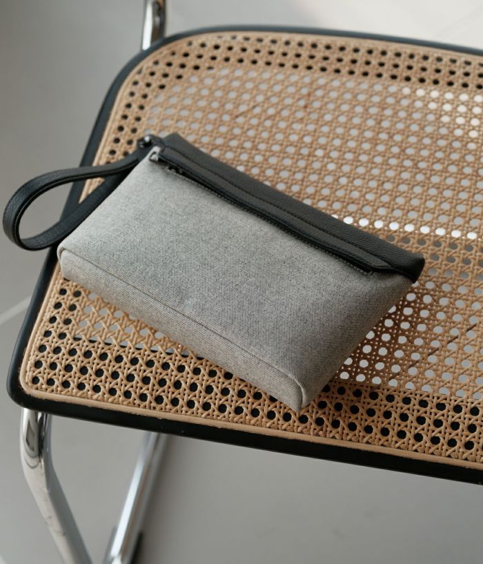 長財布がすっきり収まるコンパクトサイズ。手首に掛けても、手持ちしても軽やかに持ち運べるポーチです。