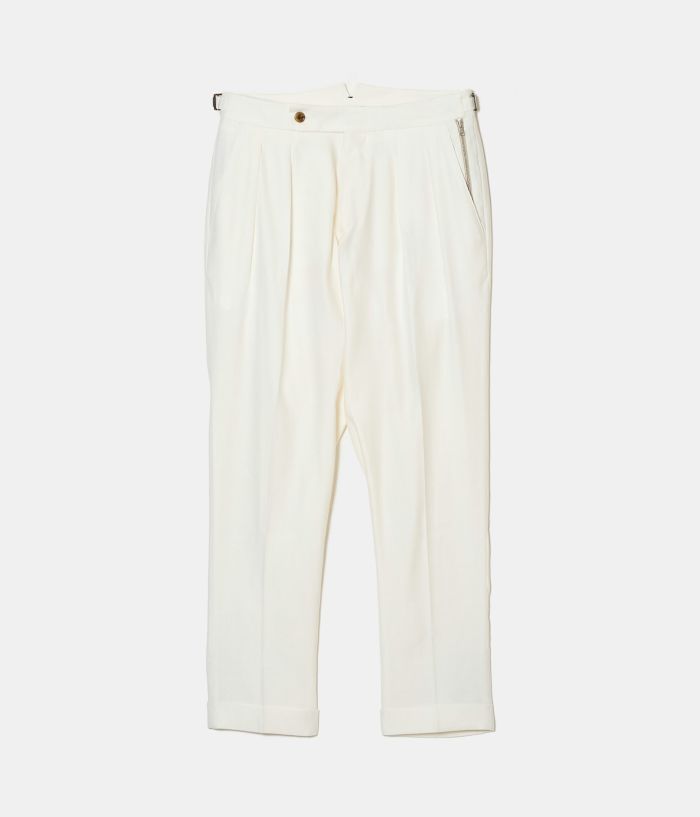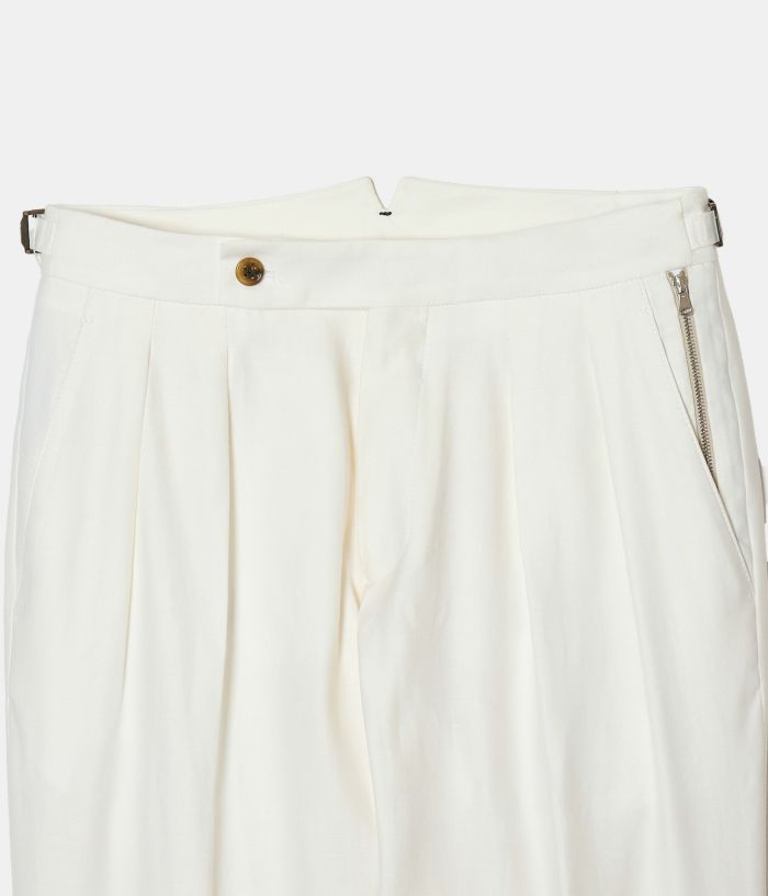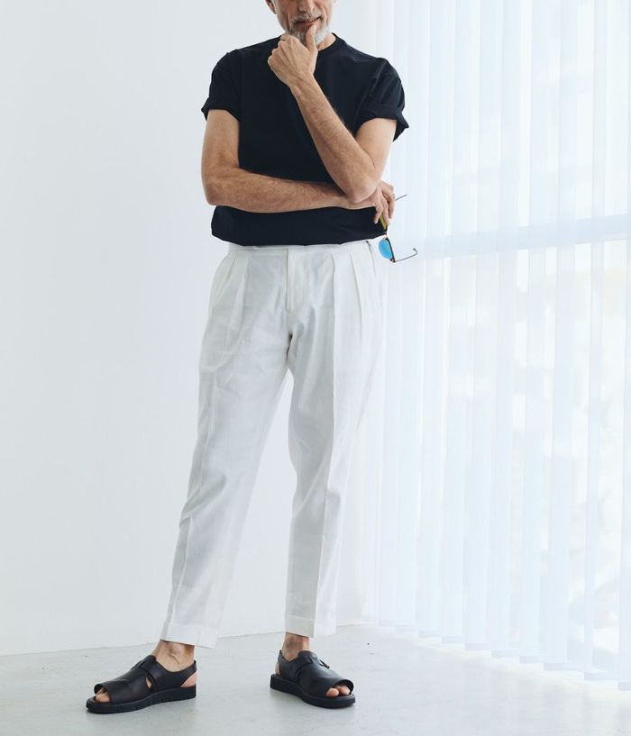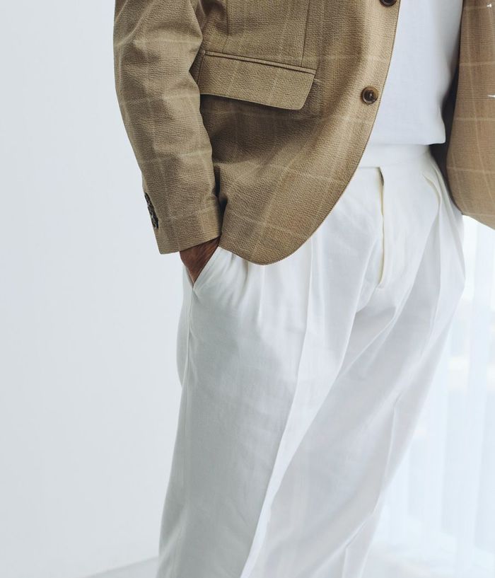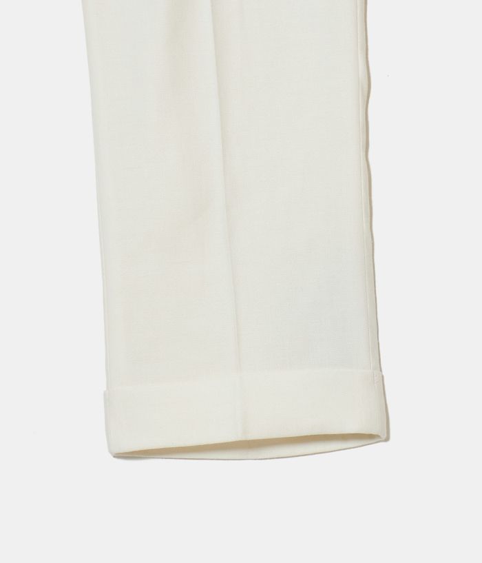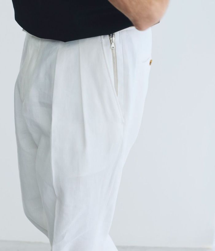 BERWICHのアイコニックなモデル**「SCOTCH(スコッチ)」**は、2プリーツとサイドアジャスターを備えたクラシカルな仕様が特徴。 ゆったりとした腰回りから裾にかけて美しくテーパードされたシルエットが、モダンクラシックな表情を演出します。 また、左ポケットにはブランドアイコンであるサイドZIPを配置し、さりげないアクセントをプラス。 素材には、上質でドライタッチなリネンコットンを採用。 通気性に優れ、清涼感があるため、盛夏でも快適な着用感を実現します。 さらに、穿き込むほどに生地が馴染み、SCOTCH特有のシャープなルックスにこなれた抜け感をプラス。 清涼感がありながらも、ジャケットスタイルはもちろん、シャツやTシャツをインしたスタイルとも相性抜群。 カジュアルからキレイめまで、幅広いコーディネートにマッチする絶妙なバランスが魅力の一本です。