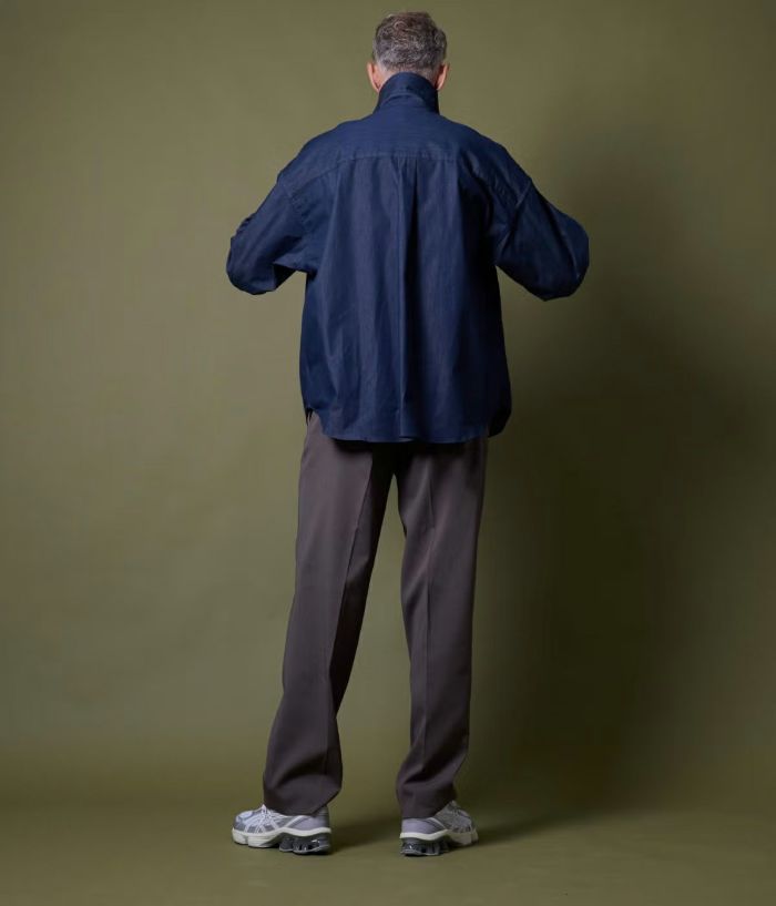 シルエットは1タック入りで程よくワイドなバランス。フロントは持ち出し付きの前カン仕様にすることで、すっきりとしたきれいめな印象にまとめています。ウエストは後ろゴム仕様で、見た目のスマートさを保ちながらリラックスした履き心地を実現。大人の余裕を感じさせるシルエットが、都会的なスタイルを引き立てます。