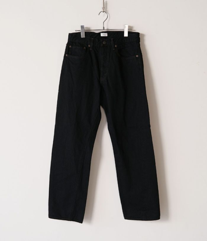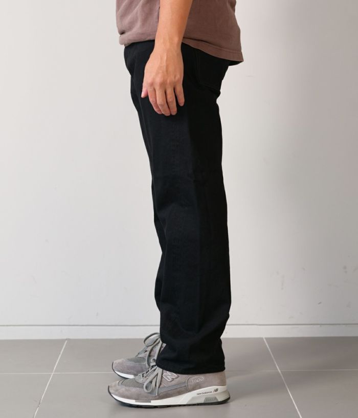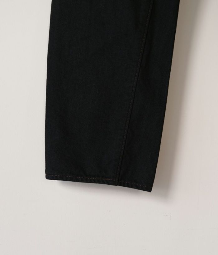 定番として展開し続けてきたテーパードモデルがフルリニューアルしました。生地は、のり抜き、防縮、斜行止め、毛焼きなどをしていない“生機”に変更。縮みやよじれが起こりますが、デニム本来の質感、経年による表情の変化を楽しめます。膝から裾にかけて緩やかに細くなったテーパードシルエットは、これまでよりもやや太めに変更。1970年代のヴィンテージジーンズをサンプリングしていて、ファスナーは42TALON、ポケット裏はシングルステッチ、バックポケットの形はやや細長いデザイン。ブラックとグレーデニムはタテ糸に硫化染料によるロープ染色の中白糸を使用。ヨコ糸はどちらも超長繊細綿・スビンコットンを使い、旧式力織機(シャトル織機)でセルビッチデニムに仕上げています。