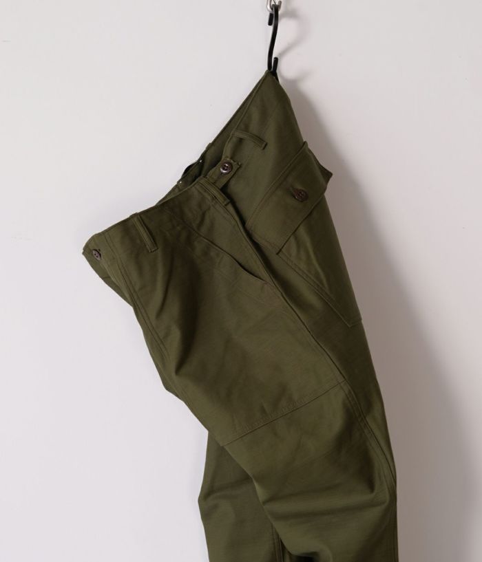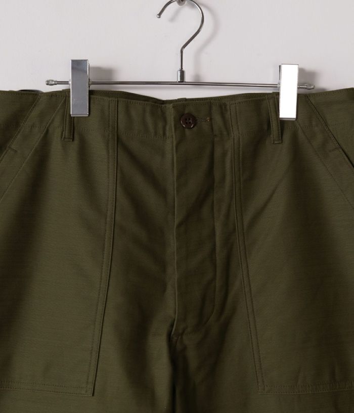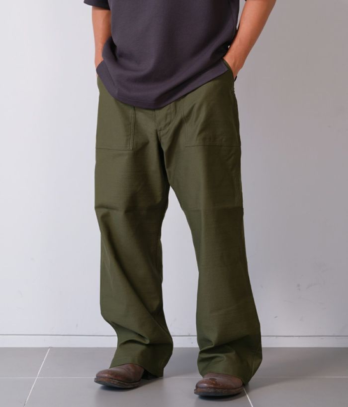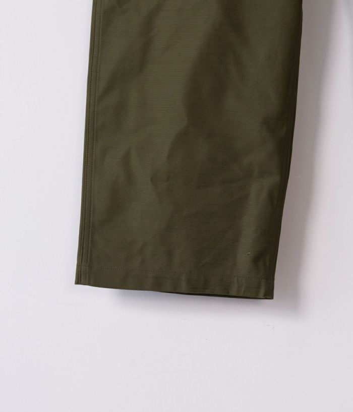CIOTAのベイカーパンツの中で最も太い、バギーシルエットモデルです。生地はミリタリーウェアの定番素材、バックサテン。試作を繰り返してようやくたどりついた、オリジナルのムラ糸で織り上げました。タテ糸、ヨコ糸ともに、スビンコットン100%なので、高密度ですが、ソフトな風合いで肌触りはなめらか。洗うほどに柔軟さは増し、表情豊かに。経年変化も楽しめる素材です。デザインとディテールは、アメリカ軍が1950年代頃に採用していた、ウエストの帯部分が一枚仕立ての希少なモデルをサンプリング。サイドアジャスター付きで、フロントはボタンフライ、尿素ボタン、アウトサイド及びインサイドのシームはダブルステッチ。