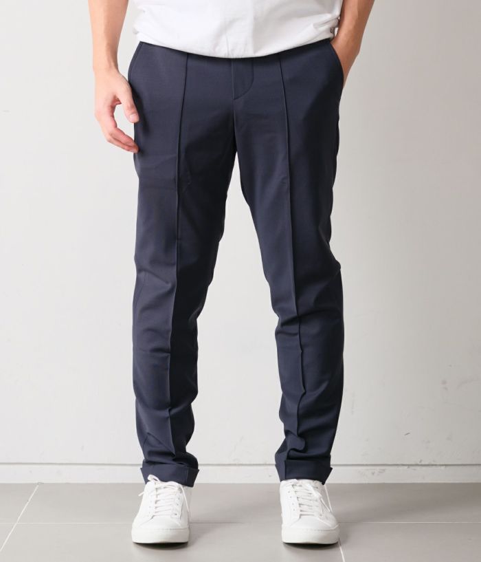 ファッションディレクター干場義雅氏の希望により、1から形を起こしたモデル名"H DUE(アッカデュエ)"から、ディテールはそのままに新素材が登場。 生地の重さは250gと軽すぎず、重すぎない絶妙なバランス。長い期間着用いただきやすく、とにかくさらっとしたドライタッチな肌触りは、高温多湿な日本の気候にぴったりなファブリックです。 ディテールの拘りは、イージー仕様にも関わらず、後ろ前に永久クリースを入れることで、きちっとした印象を損なわれずに穿いていただけます。 ウエイトは、ドローコード付きシャーリング仕様、フロントフライではなく、ノンファスナー仕様。 裾は敢えてダブルで仕上げていることにより、スポーティな印象に。 シルエットは、ワタリには程よくゆとりがありますが、裾にかけてはしっかりとテーパードを効かせた、絶妙な塩梅でパターンメイクされたシルエットが特徴。 BERWICHのインラインコレクションにはない、究極の大人なイージーパンツが完成。是非、ご堪能下さい。