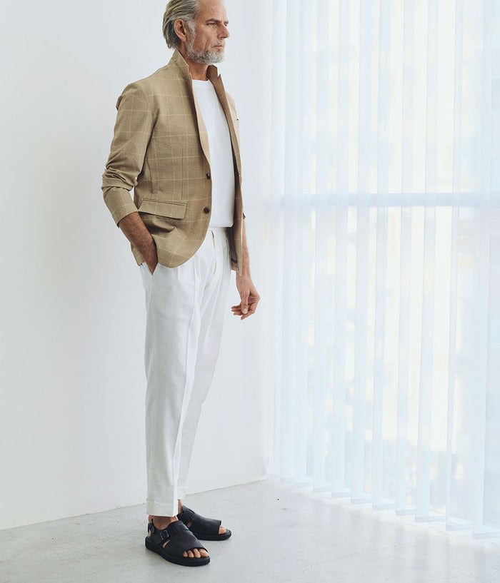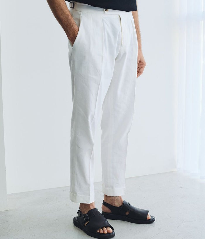 BERWICHのアイコニックなモデル**「SCOTCH(スコッチ)」**は、2プリーツとサイドアジャスターを備えたクラシカルな仕様が特徴。 ゆったりとした腰回りから裾にかけて美しくテーパードされたシルエットが、モダンクラシックな表情を演出します。 また、左ポケットにはブランドアイコンであるサイドZIPを配置し、さりげないアクセントをプラス。 素材には、上質でドライタッチなリネンコットンを採用。 通気性に優れ、清涼感があるため、盛夏でも快適な着用感を実現します。 さらに、穿き込むほどに生地が馴染み、SCOTCH特有のシャープなルックスにこなれた抜け感をプラス。 清涼感がありながらも、ジャケットスタイルはもちろん、シャツやTシャツをインしたスタイルとも相性抜群。 カジュアルからキレイめまで、幅広いコーディネートにマッチする絶妙なバランスが魅力の一本です。