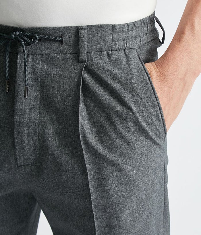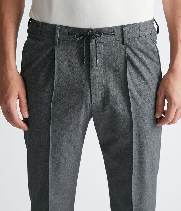 ウエストにはサイドリブを採用し、心地よいフィット感を実現。ドローコードは内側に収納できる設計で、ビジネスシーンにも対応します。