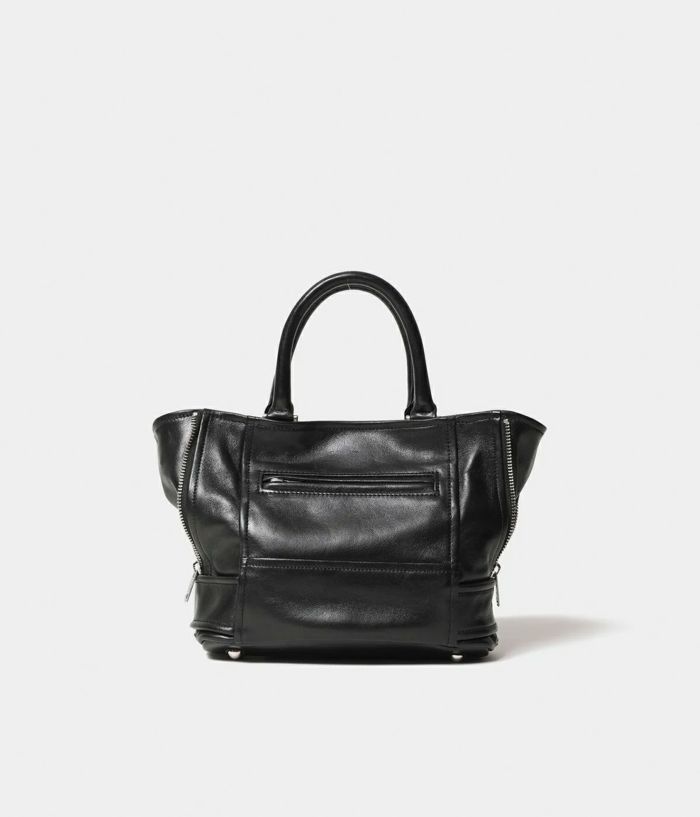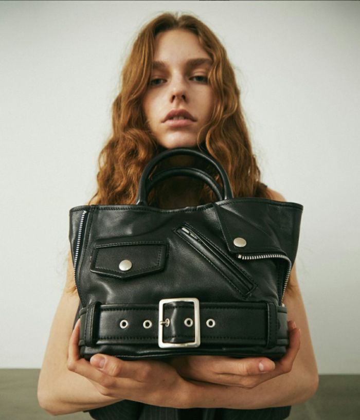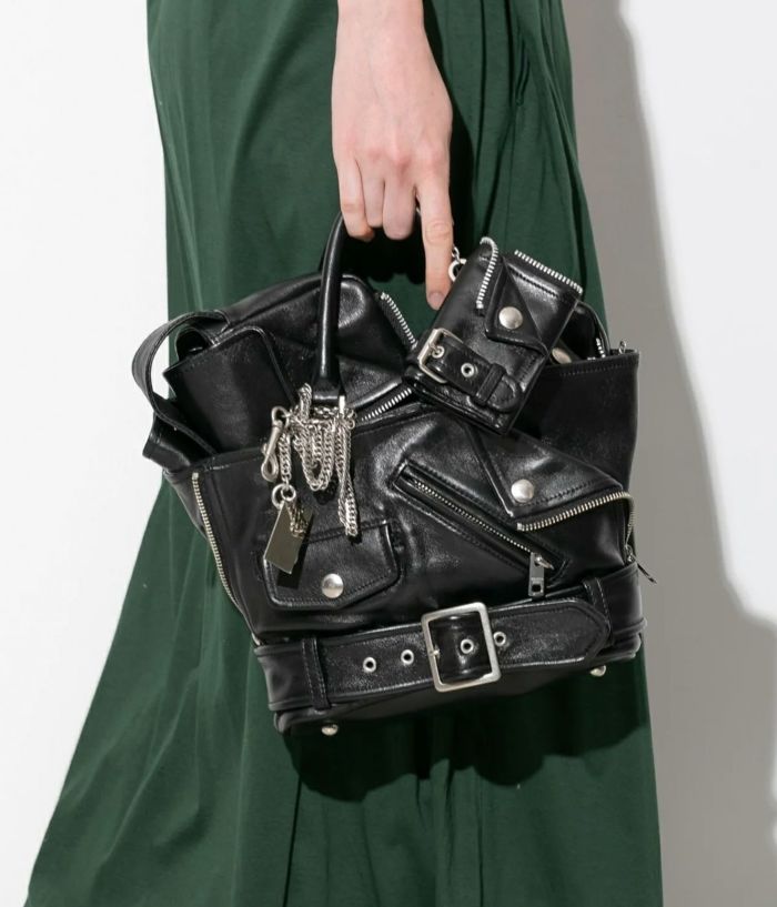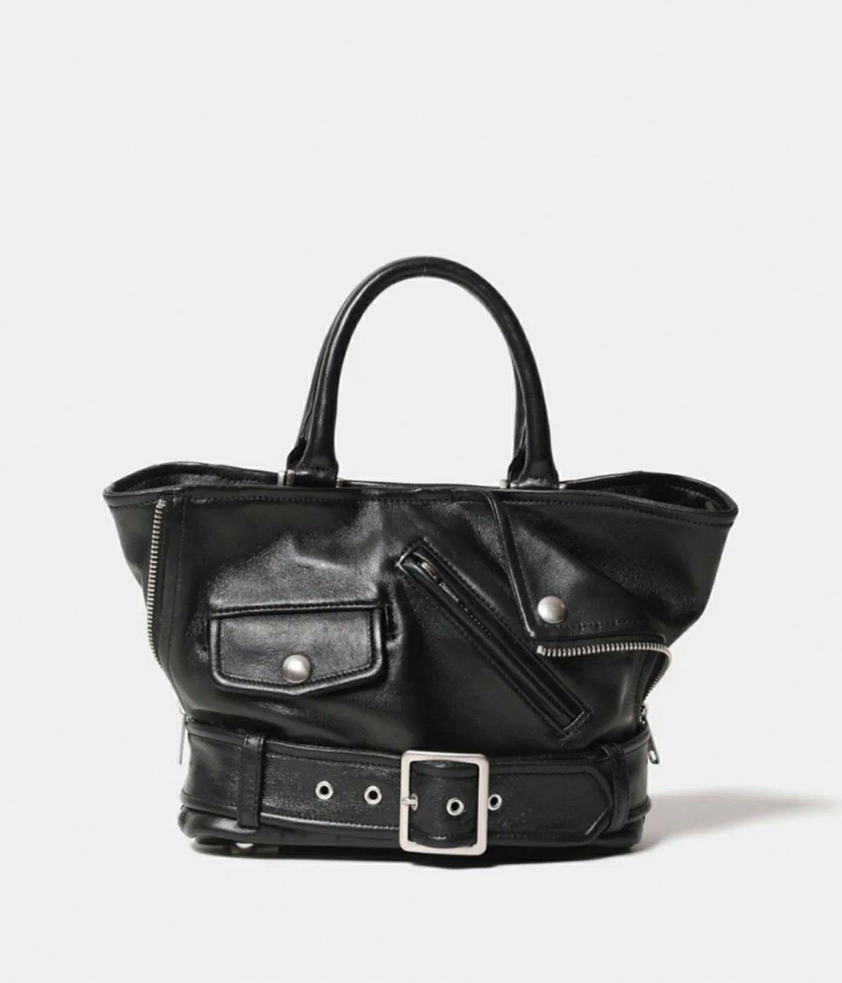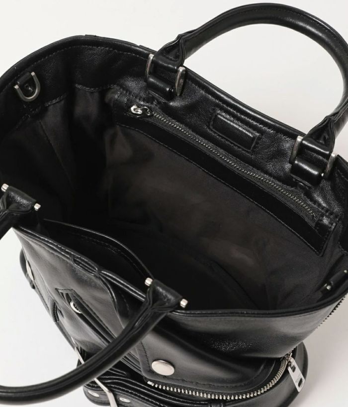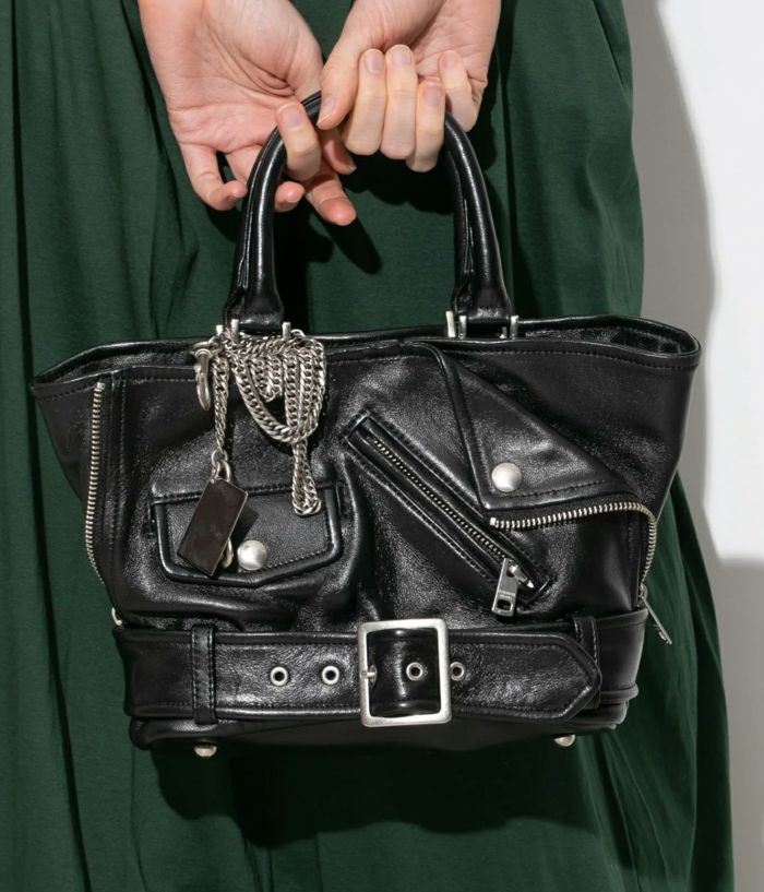 ・底形状をライダースJKの腰部分のラインにしリニューアル ・ライダースジャケットのディテールをギュッと凝縮したようなデザインが魅力 ・あおりポケット付きで使いやすいデザイン ・両端のファスナーで全体のフォルムが変わる ・ショルダーとして持てる取り外し式のチェーンショルダーを付けるカン付き ・外 ポケット×5 ・中 ポケット×1