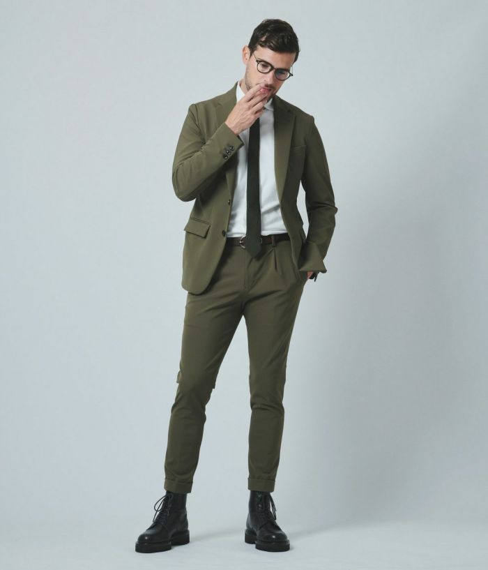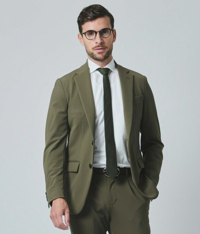 シルエットは、タイトすぎず程よいフィット感のある2Bジャケットを採用。クラシックな印象を与える控えめなラペルと適度な着丈が特徴です。生地の持つスポーティーさと、フォーマル感を演出するシルエットが調和し、モード感のあるジャケットスタイルを実現します。