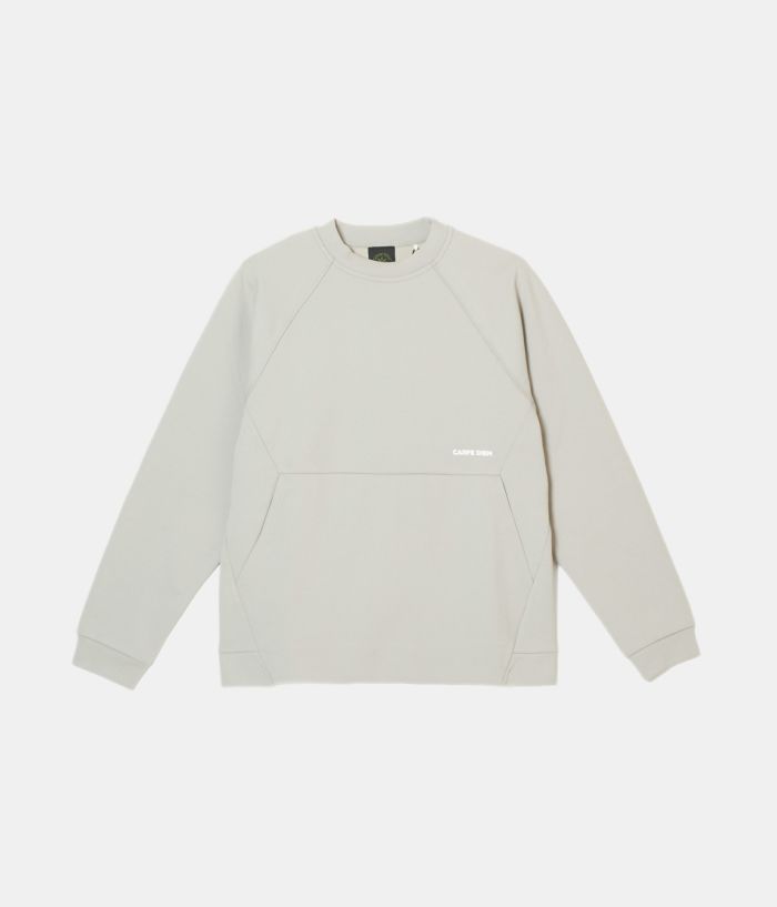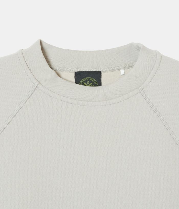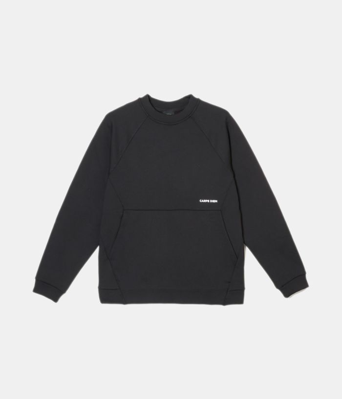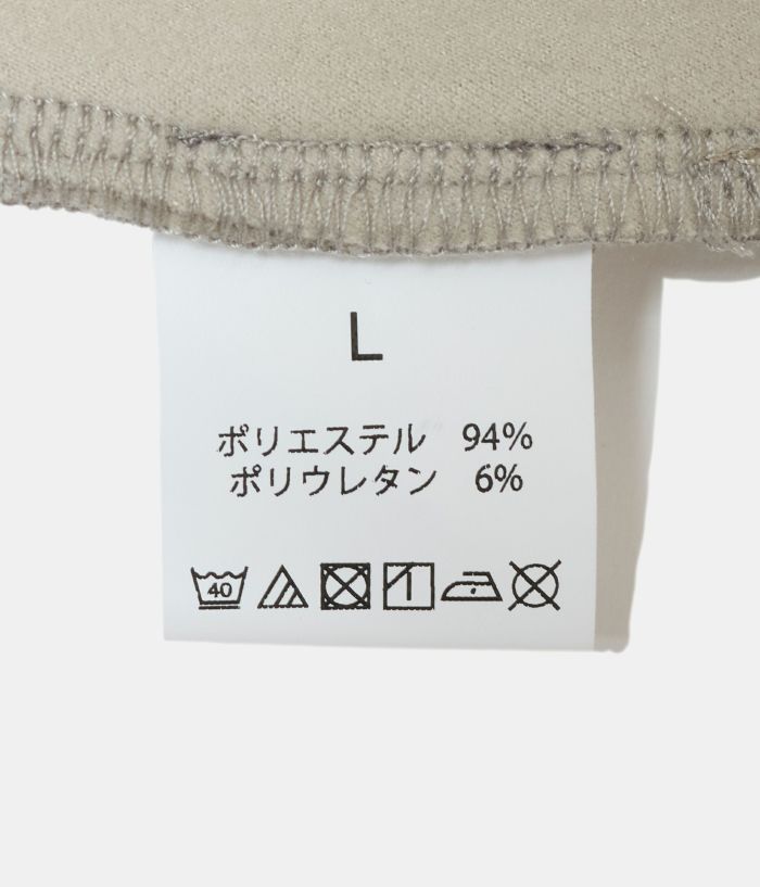 素材感のあるポリエステルの裏面を起毛させることでハリを持たせた素材を使い、極力シンプルなデザインの中にカッティングパターンでポケットを配置する事でデザインと実用性を兼ねたクルースエット型。