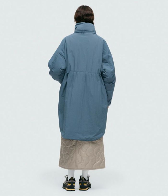 腕のベルクロワッペンもなくし、前ファスナーのスライダーをリング型にすることでミリタリー感を軽減。 袖口リブのインナーカフスが風の侵入を防ぐ。 ロゴも主張を控え、後ろ身の衿下に生地と同色でプリント。 近年の日本の気候や、レイヤードのし易さ、収納性に配慮し中綿量を調整することで、オーバーサイズながら膨らみすぎないスッキリしたシルエット。 ウエストはドローコード採用でシルエットの変更が可能。