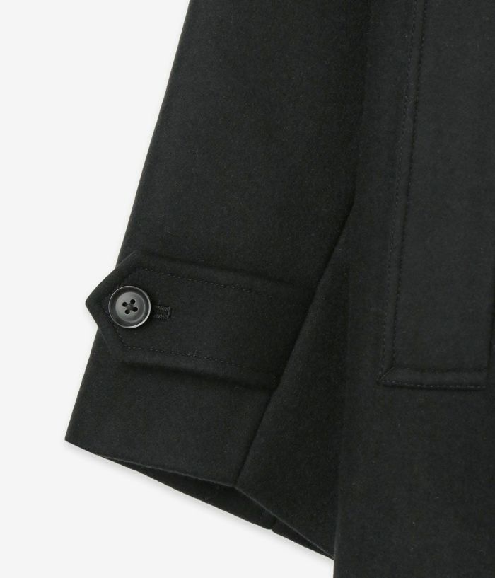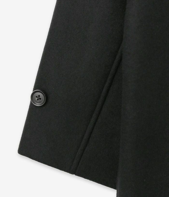 上品なブラックカラーが幅広いシーンにマッチし、オンにもオフにも活躍する一着です。 素材には、ウール100%のメルトン生地を採用。