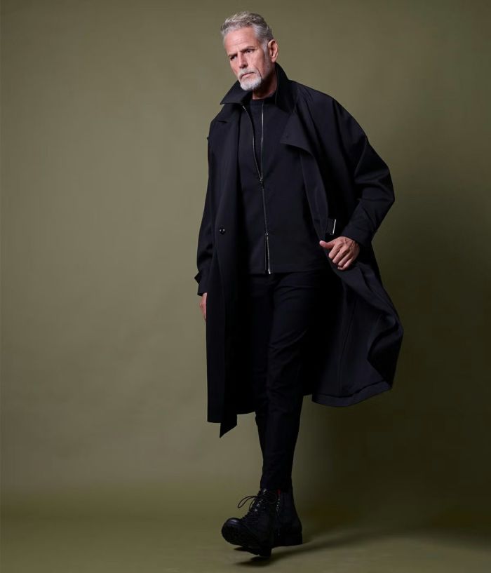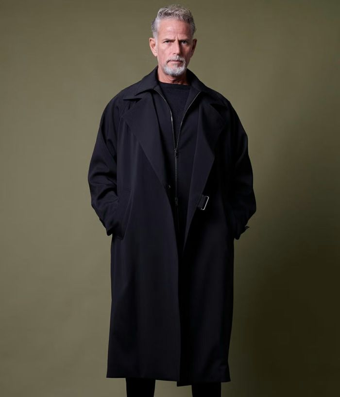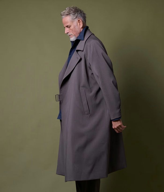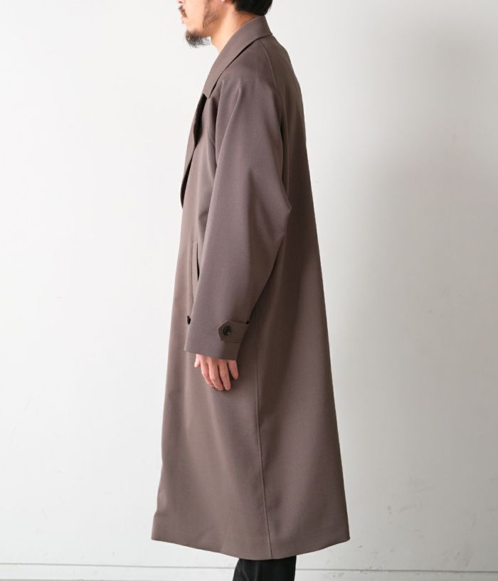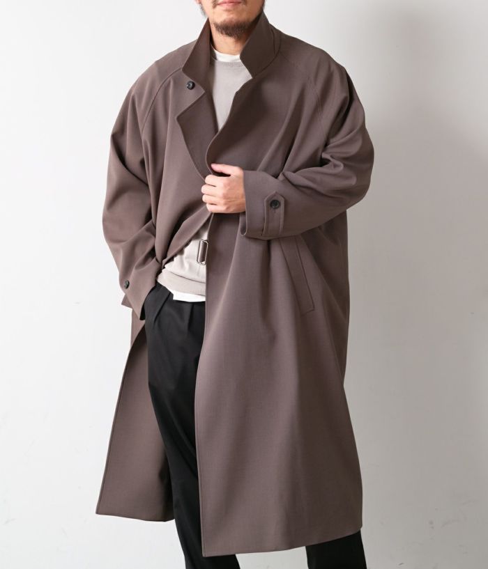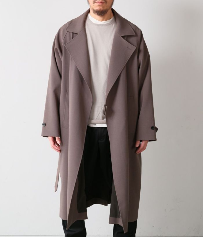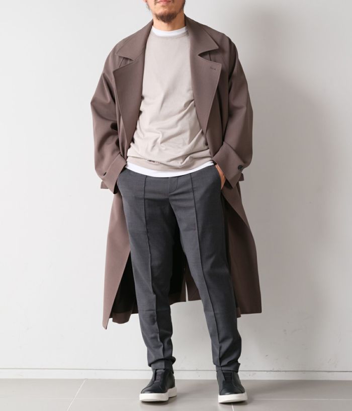 ルーズなシルエットを活かし、羽織るだけでスタイルに余裕を生み出すタイロッケンコート。