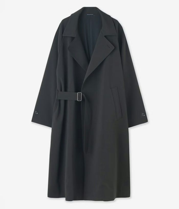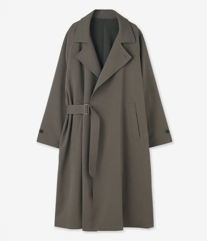 フロントを開けてラフに羽織ることも、ベルトを締めてシルエットに変化をつけることもでき、シーンや気分に合わせた着こなしが可能。背中部分と身頃裏で裏地を切り替えるなど、見えない部分にも細かな工夫を施しています。さらにベルトを内側に収納できるなど、実用性とデザイン性を兼ね備えたディテールも特徴です。