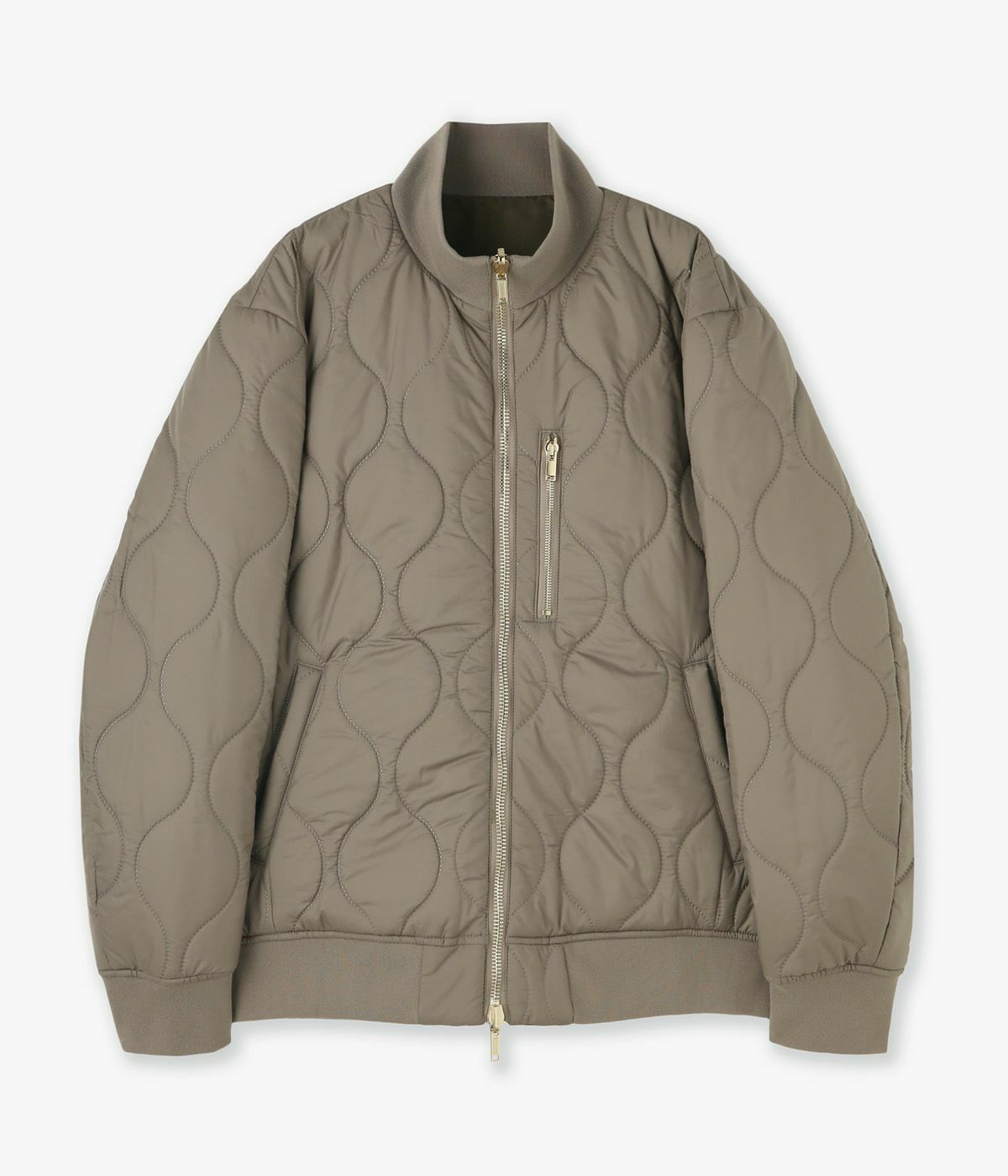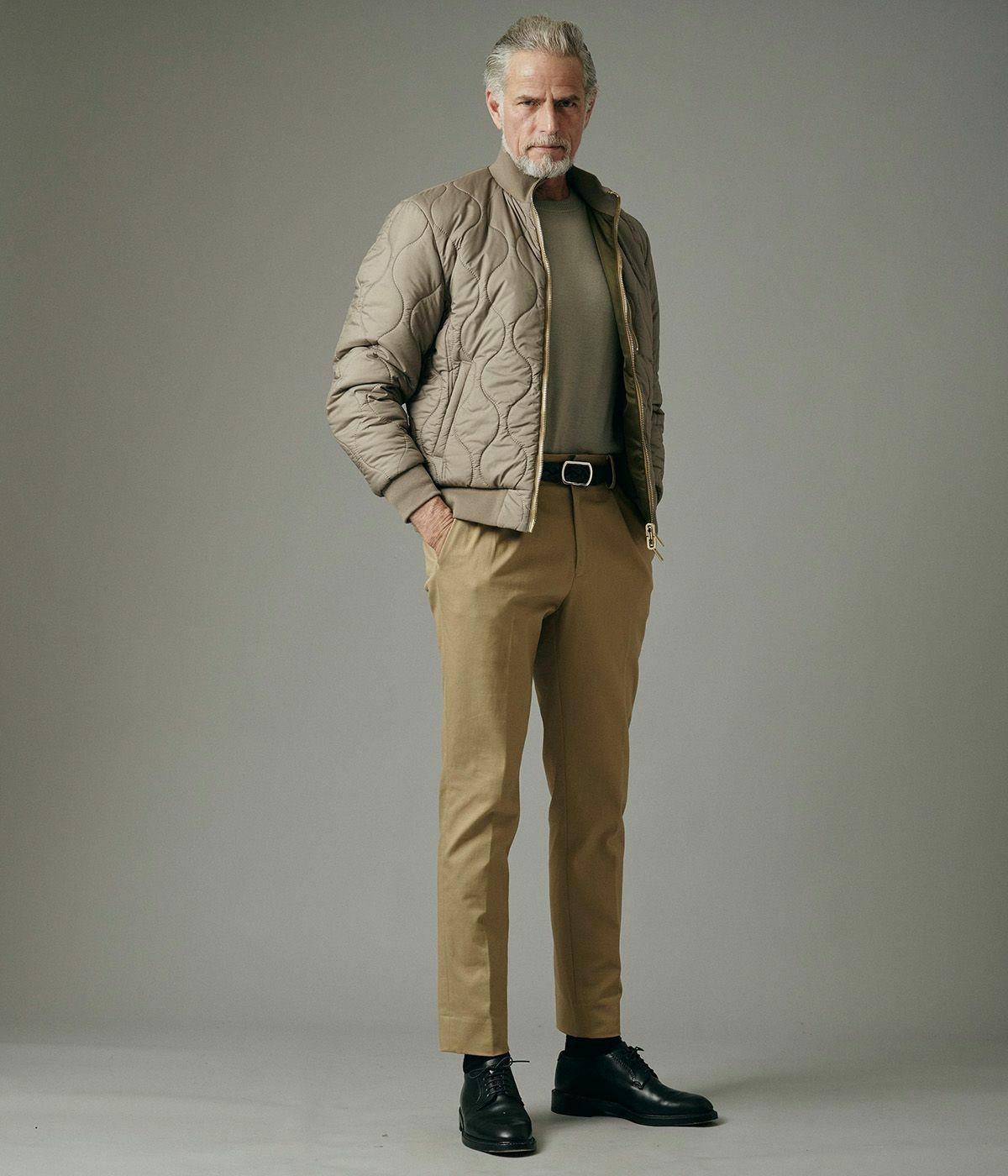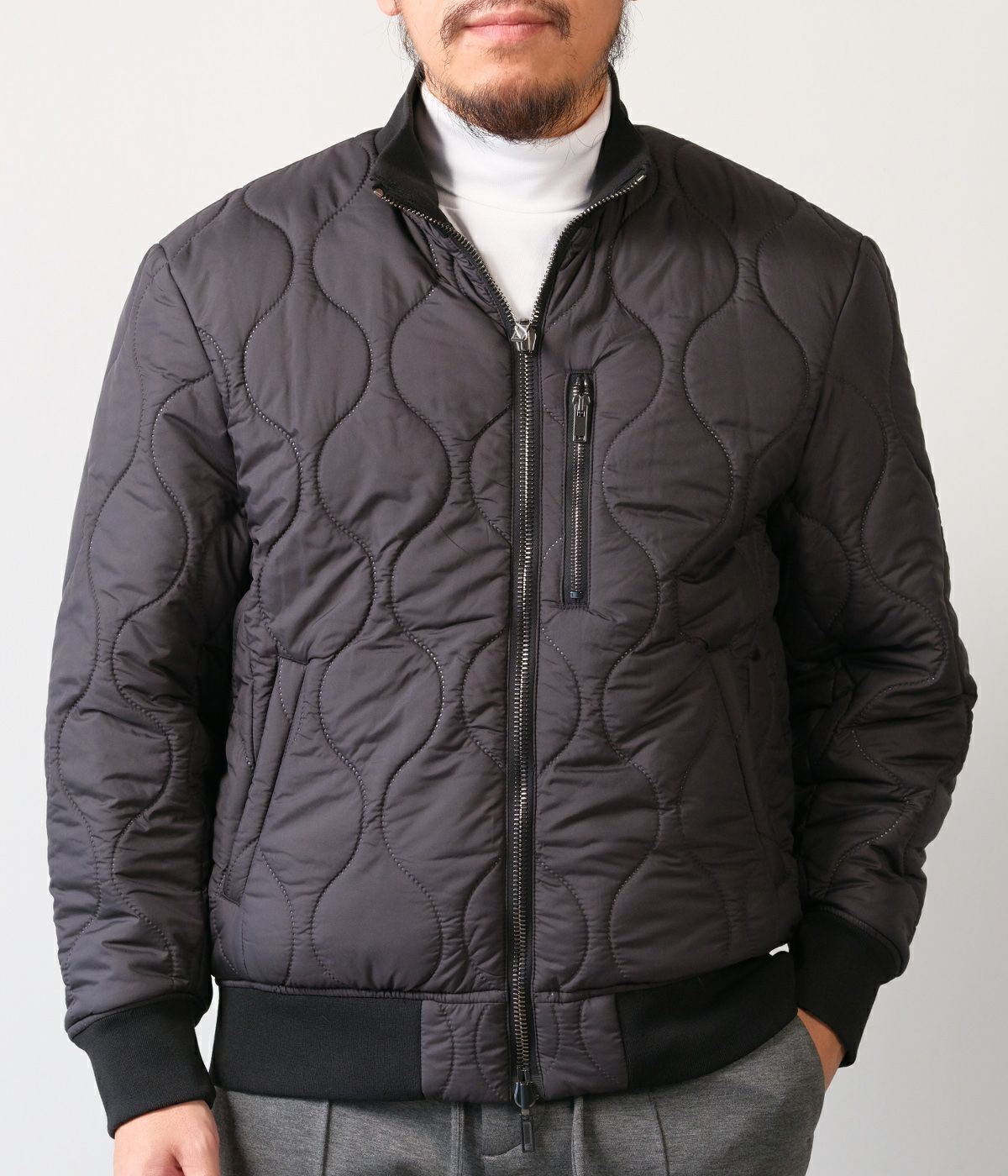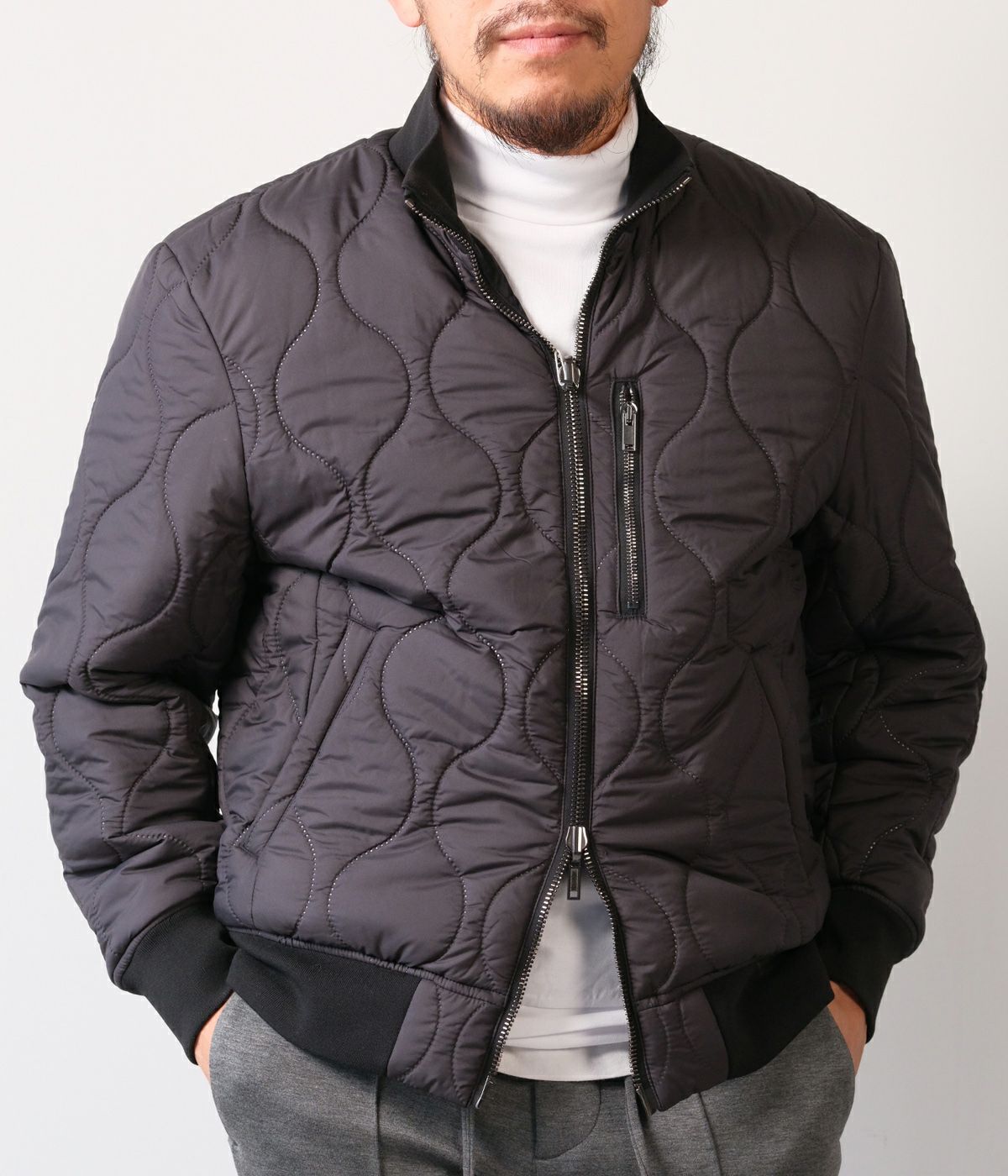 キルティングの表情が品よく映えるスタンドブルゾンは、襟の立て方ひとつでガラリと雰囲気が変わる洒脱な一着。