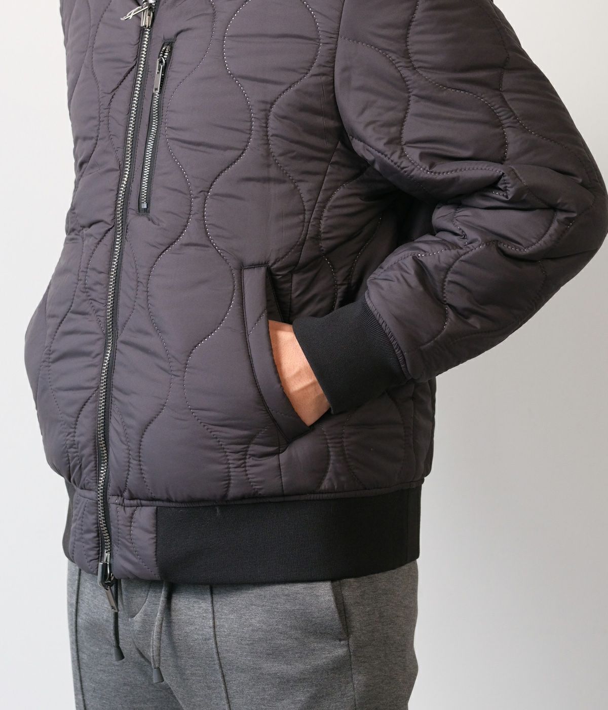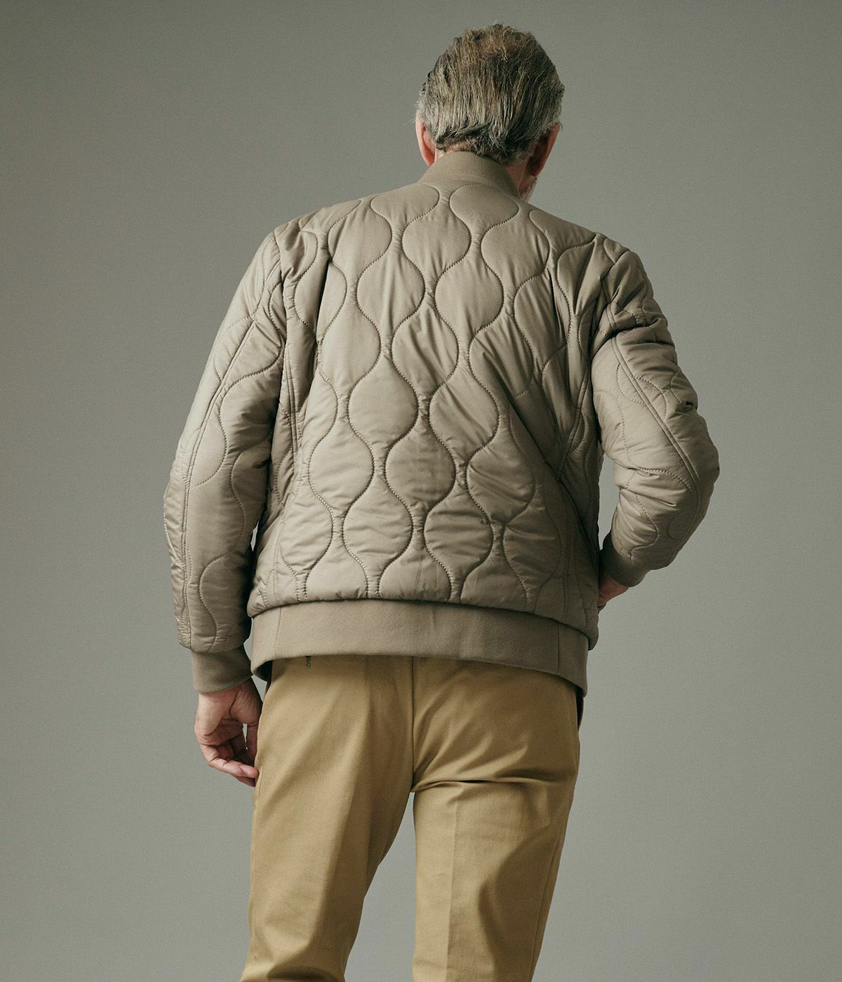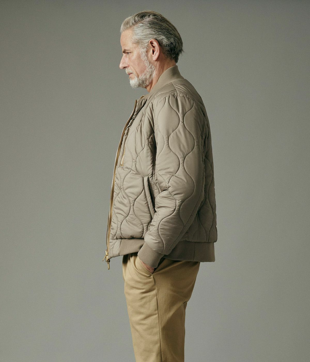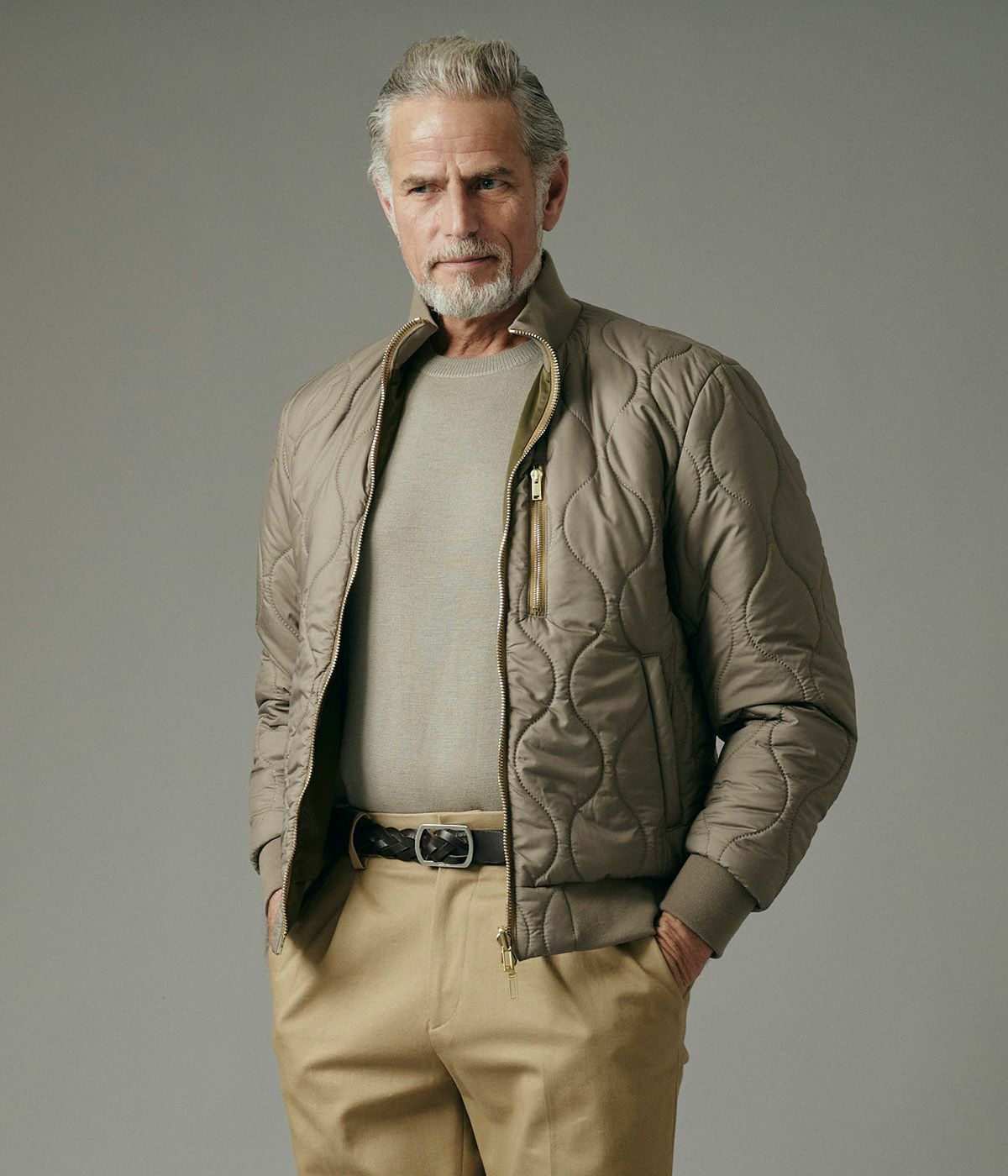 キルティングの表情が品よく映えるスタンドブルゾンは、襟の立て方ひとつでガラリと雰囲気が変わる洒脱な一着。
