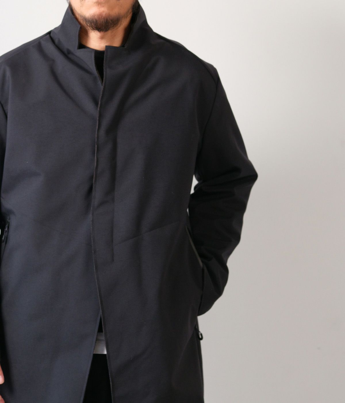 表にタスランナイロン糸を使用した3層ラミネートの素材。(耐水圧196kpa以上 透湿性8,000g/㎡-24hrs以上。) ハードな天然素材のようでありながら機能性を兼ね備えたハイブリットな素材で透湿防水サイトス加工が施されている。 内側にはフリースを使用し、非常に軽くて暖かい。 太すぎず、細すぎない美しいシルエット。 着用モデル:176cm 62kg 着用サイズ:M