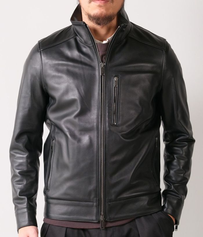 無駄を削ぎ落としたシングルライダースのミニマルなデザインにより、インナー使いからアウターとしての着用まで幅広く対応。タイトすぎず、すっきりと身体に沿うシルエットは、ジャケットやコートの下にも収まりが良く、スタイリングを選びません。シンプルながら、上質なレザーの存在感が際立つ一着です。