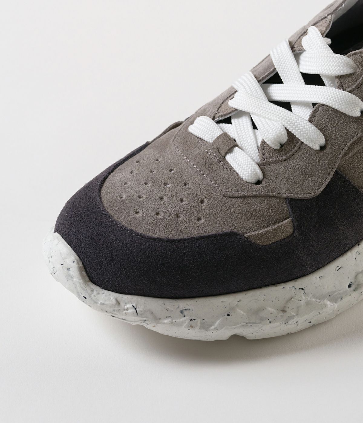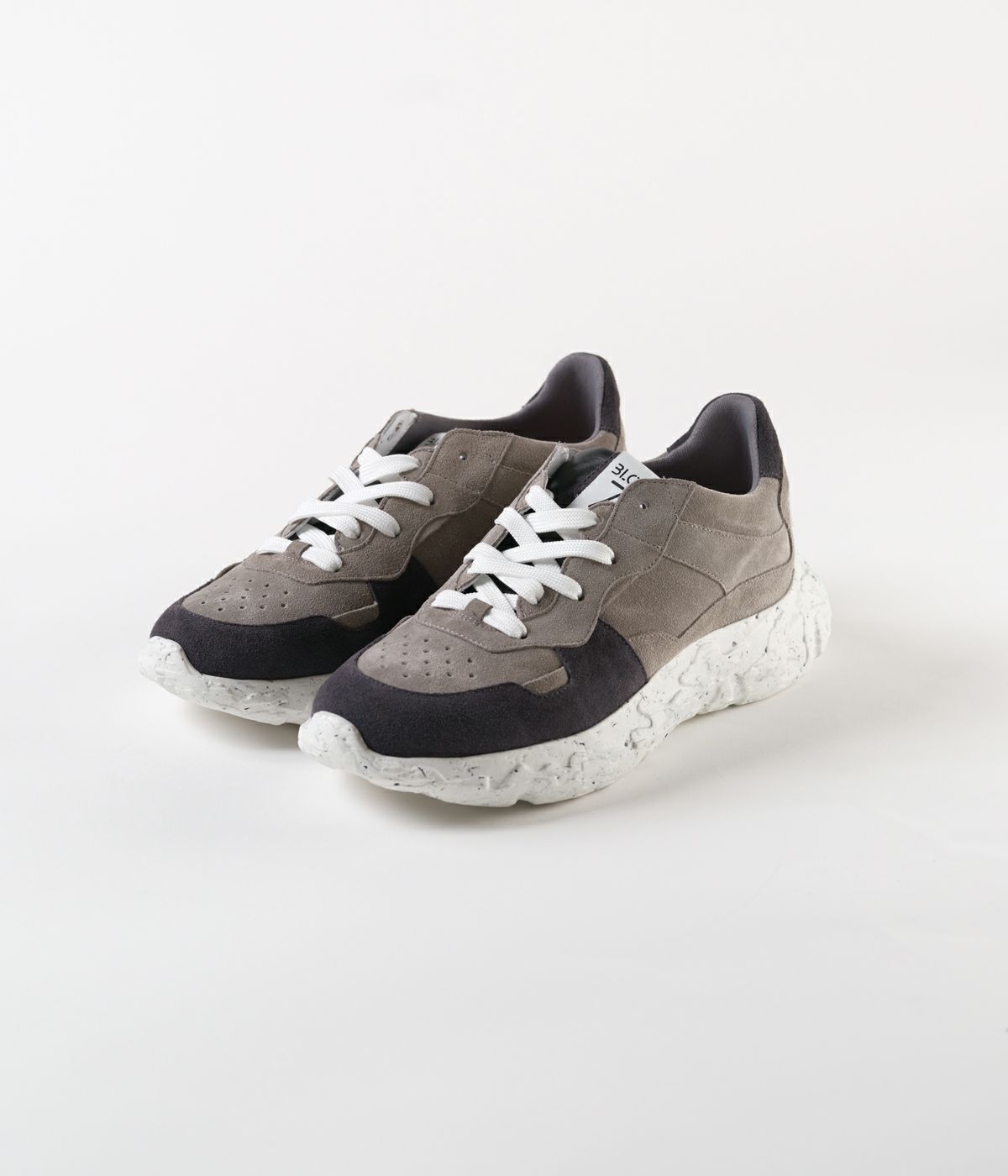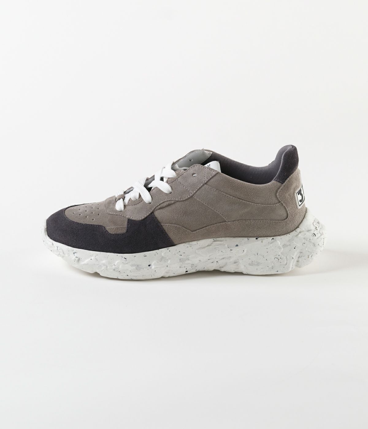 「ジュンハシモト」のデザイナーである橋本氏が監修。深みのあるチャコールカラーのスエードを使用し、しっとりとした質感とマットな表情で落ち着きがありながら、ボリューミーなソールにより、快適な履き心地とタフな存在感を放ちます。 ※注意事項 摩擦:素材の特性上ズボン、靴下等に製品の1部が色移りする場合がございますのでご使用の際はご注意ください。