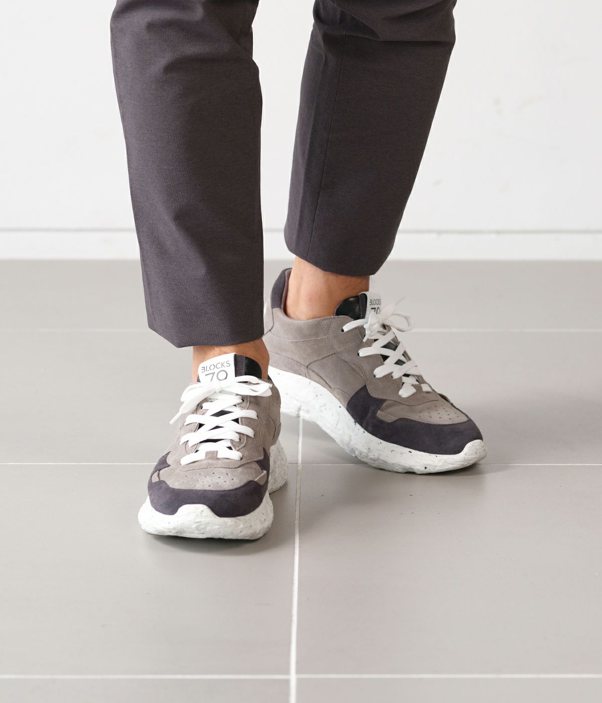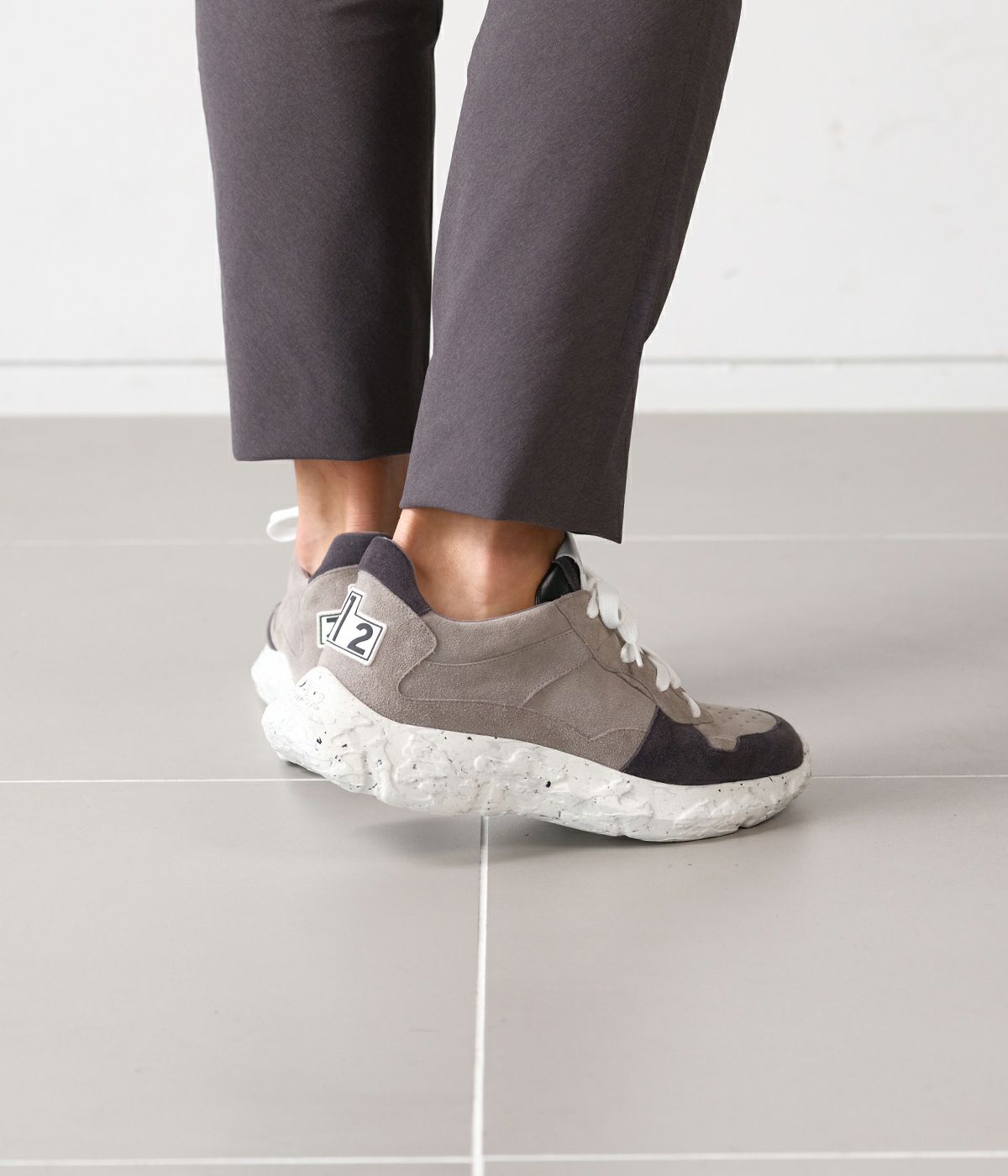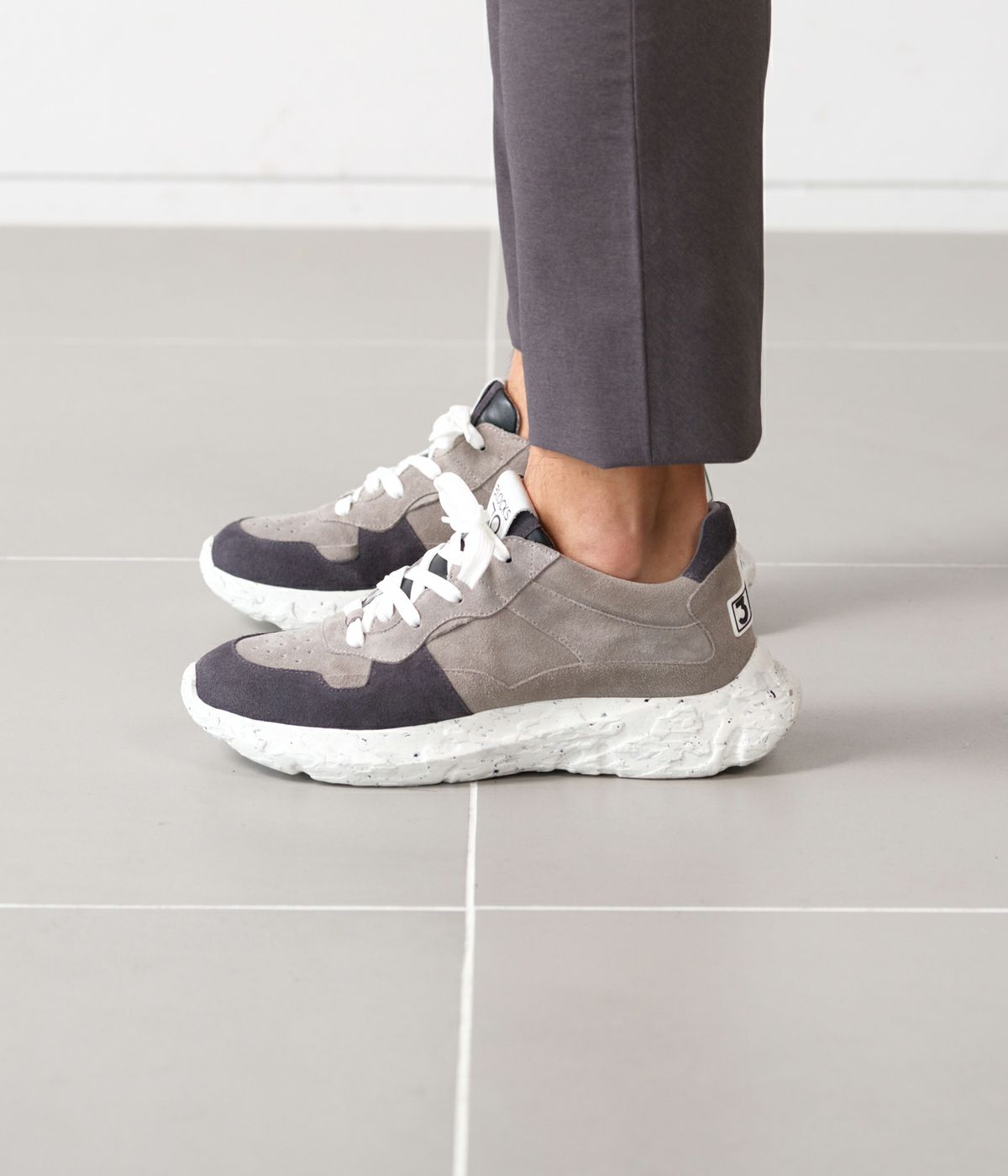 「ジュンハシモト」のデザイナーである橋本氏が監修。深みのあるチャコールカラーのスエードを使用し、しっとりとした質感とマットな表情で落ち着きがありながら、ボリューミーなソールにより、快適な履き心地とタフな存在感を放ちます。 ※注意事項 摩擦:素材の特性上ズボン、靴下等に製品の1部が色移りする場合がございますのでご使用の際はご注意ください。