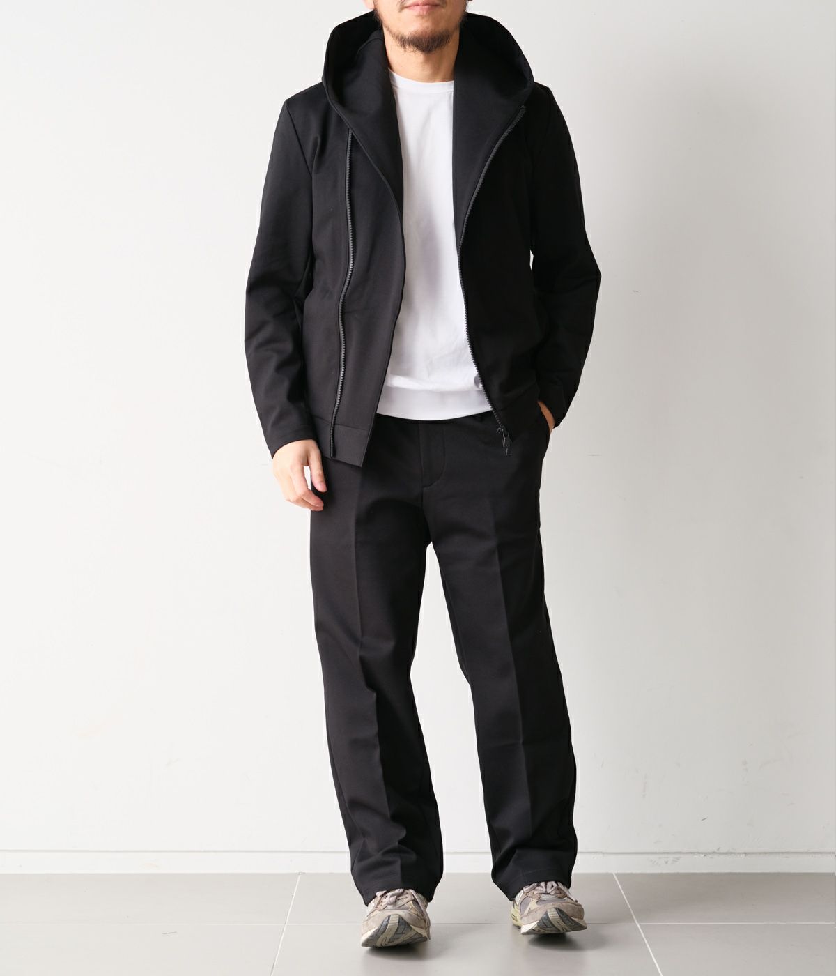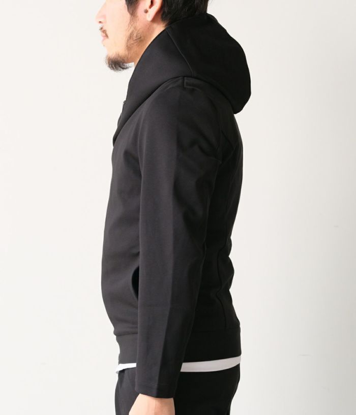 WRAP COATのフードデザインとセミライダースのディテールを掛け合わせ、無駄を削ぎ落としたミニマルなデザインに構築。身体に自然とフィットするよう計算されたスリムシルエットが、スタイリッシュで洗練された印象を演出します。