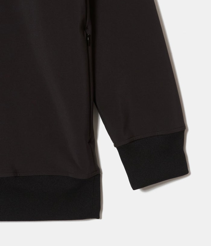 極薄のポリPuのストレッチタフタとストレッチジャージをボンディングし、肌に当たる内側に起毛をかけ着心地をアップさせたAWにおすすめの素材。