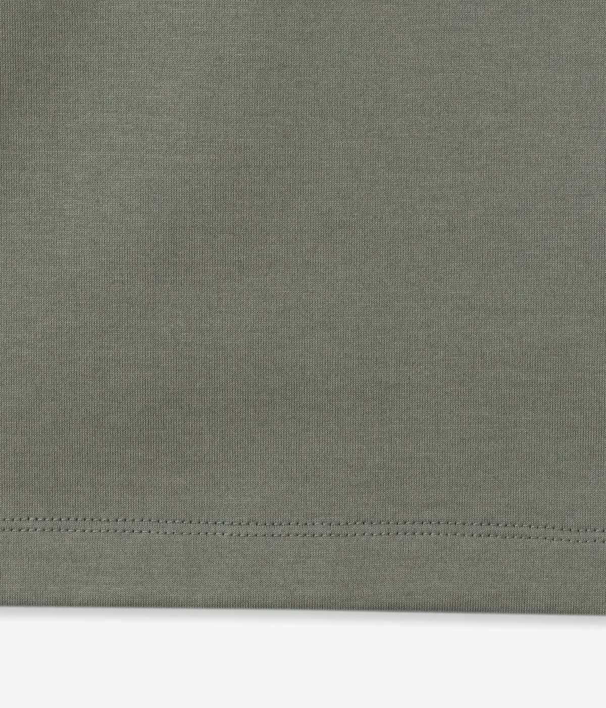 肉厚でハリのある天竺素材を採用。20~30番クラスのコンパクト糸を使用し、毛羽立ちを抑えながらもしっかりとした質感に仕上げています。さらにシルケット加工を施すことで、光沢感と清潔感のある表情を実現。100回洗濯してもヨレにくいタフさを誇ります。