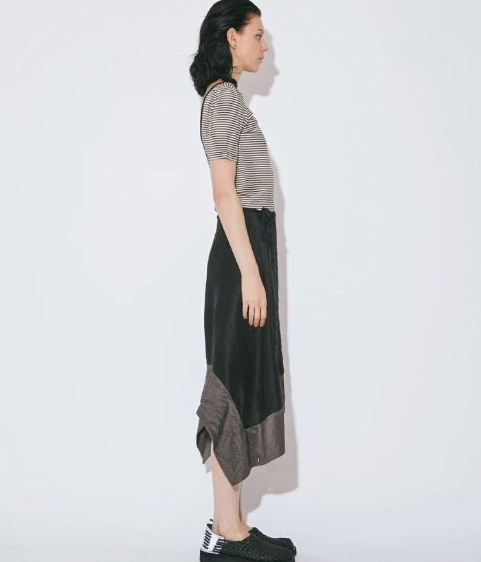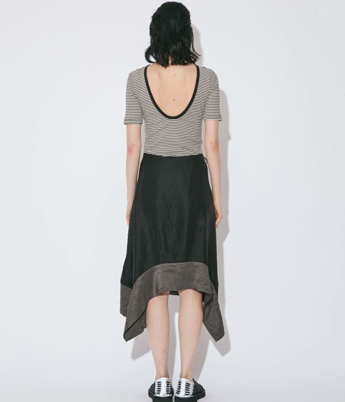 ・中間の身頃に身体を通して、クルーネックTOPをレイヤードしているかの様な着用が楽しめる