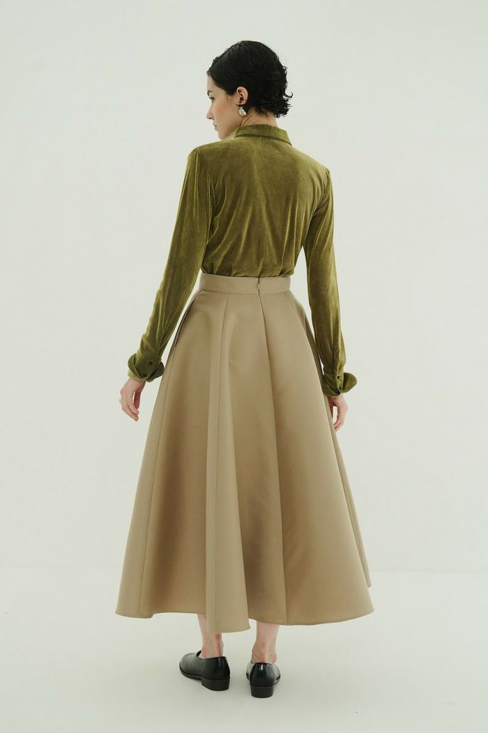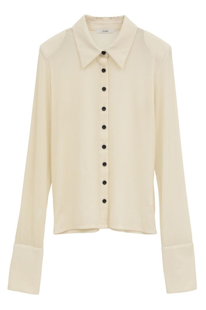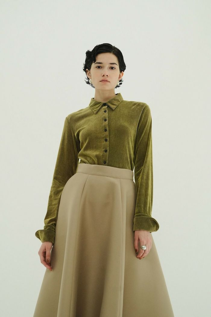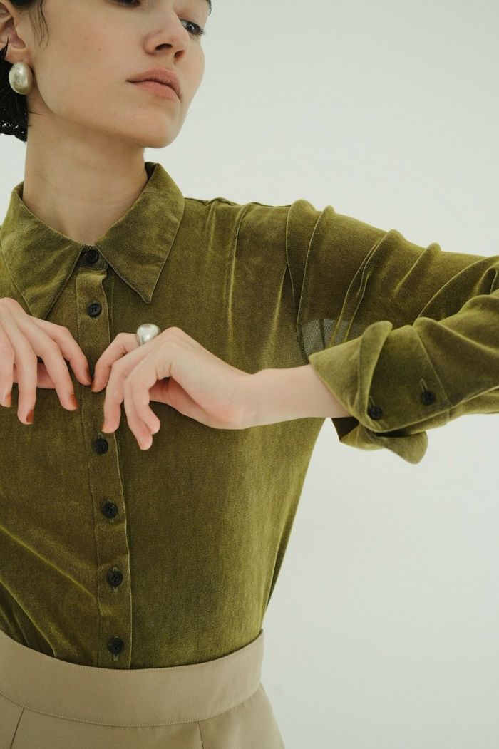 取り外し可能な肩パッドとカフスデザインを施し、CLANEらしいモードさをプラスしました。ボタンを全て留めてモードに、少し開けて女性らしく着こなすのもおすすめです。