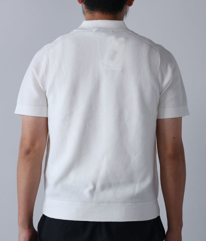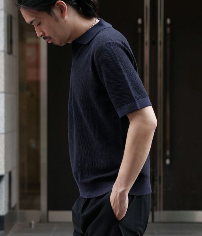 また、スキッパーのポロ衿は編みで台衿を形成し、薄くハリのある衿になるよう編み方を工夫しているので、カジュアルさと上品さを兼ねそなえています。