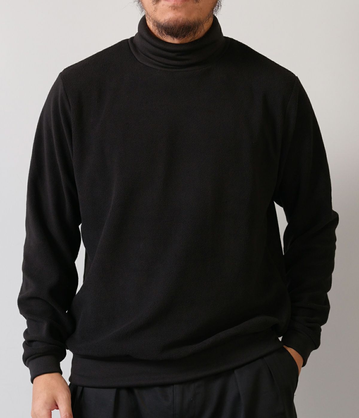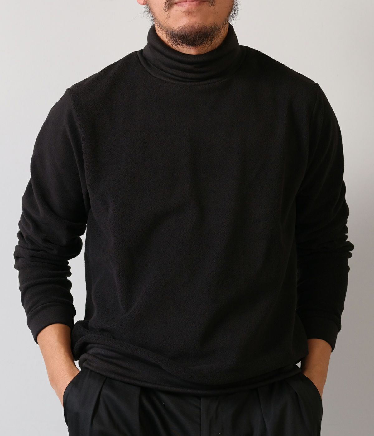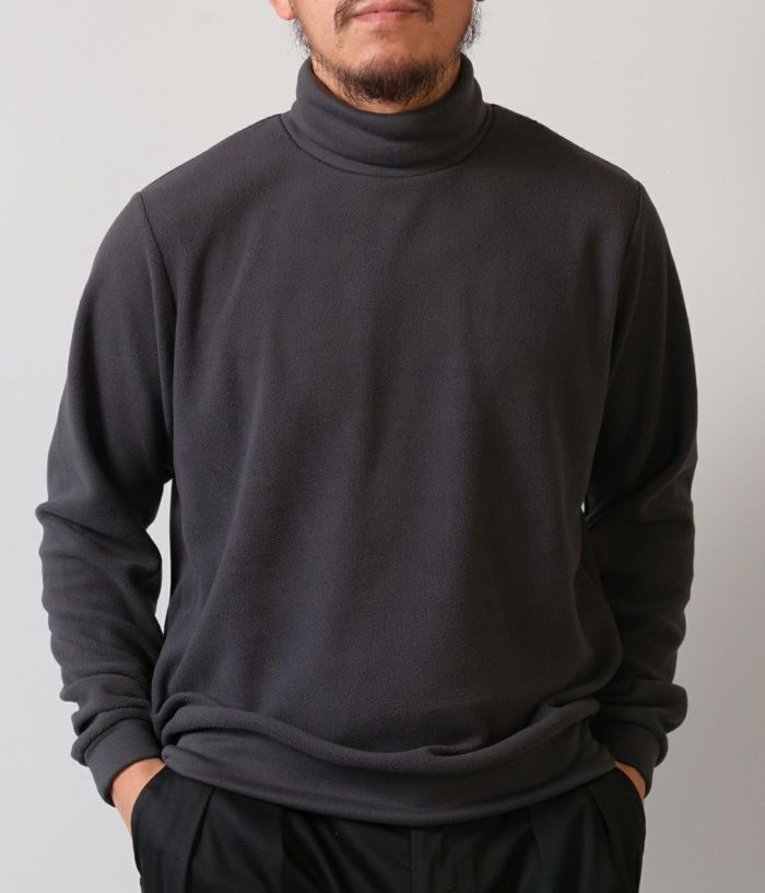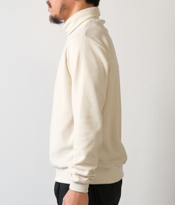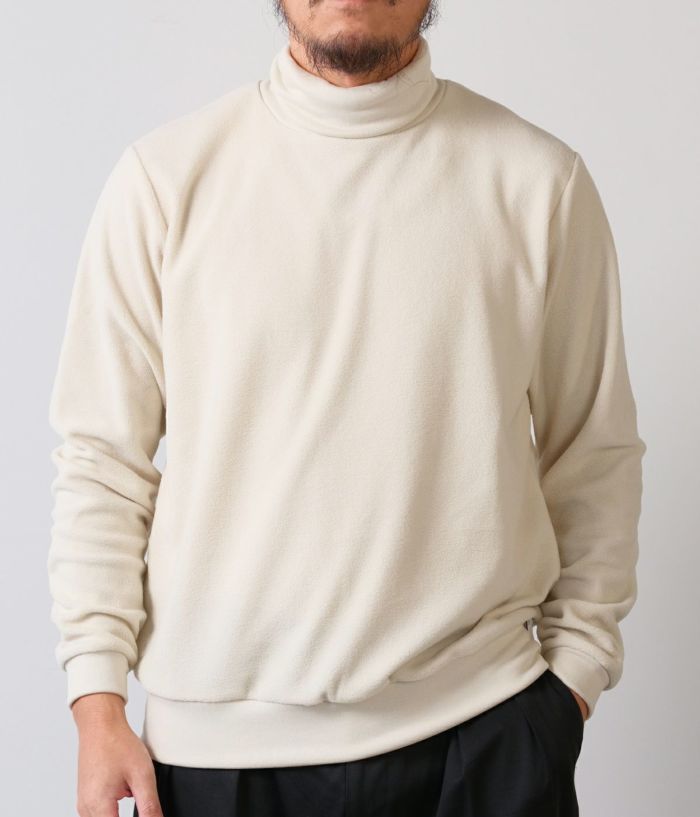 形は定番のオフタートル。しかし素材は新素材になります。着用時の心地よさが非常に良くセレクトさせて頂きました。少し肌寒くなってきた季節からはこちらがオススメです。ピタピタすぎないので1枚で着用下の時のバランスも綺麗です。
