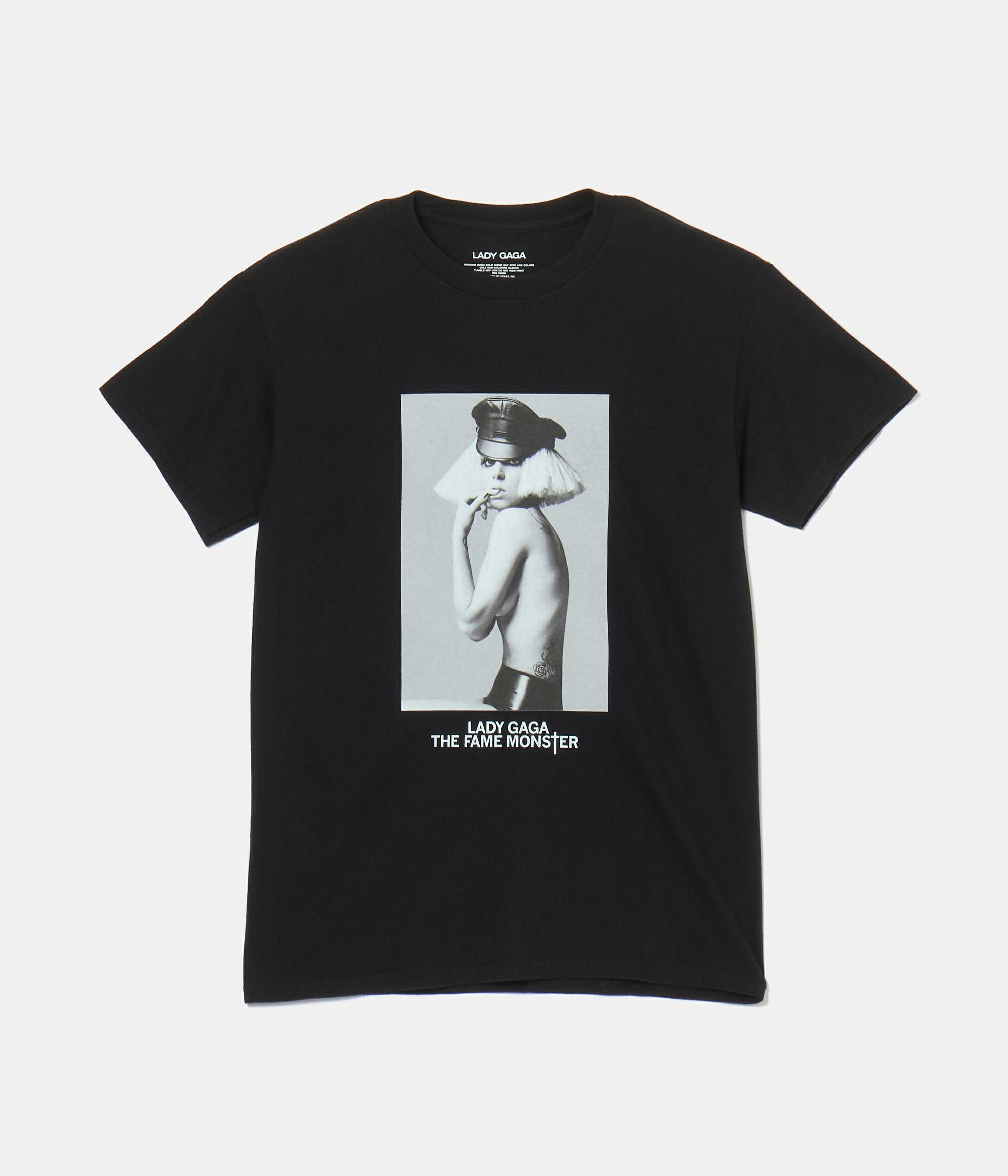 レディ・ガガの大ヒット・アルバム『ザ・フェイム』のフォトプリント。モードな印象の1着。黒いスキニーパンツやデニムで男らしく着こなしたくなる雰囲気です。
