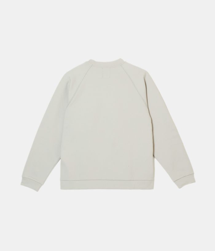 素材感のあるポリエステルの裏面を起毛させることでハリを持たせた素材を使い、極力シンプルなデザインの中にカッティングパターンでポケットを配置する事でデザインと実用性を兼ねたクルースエット型。