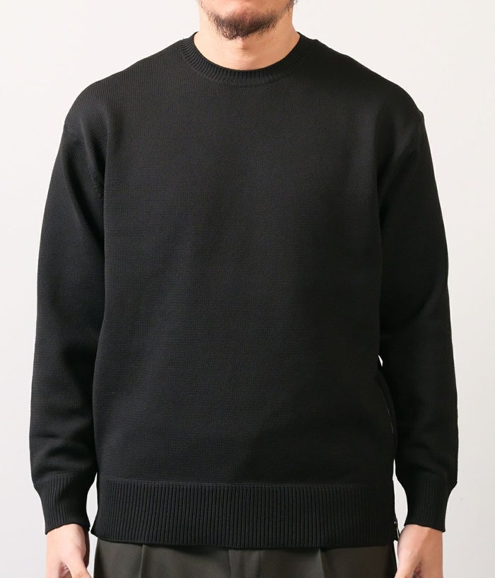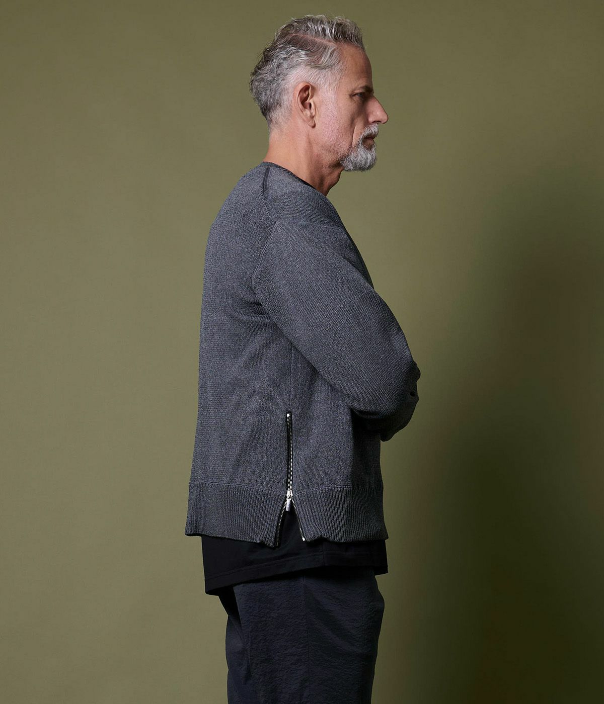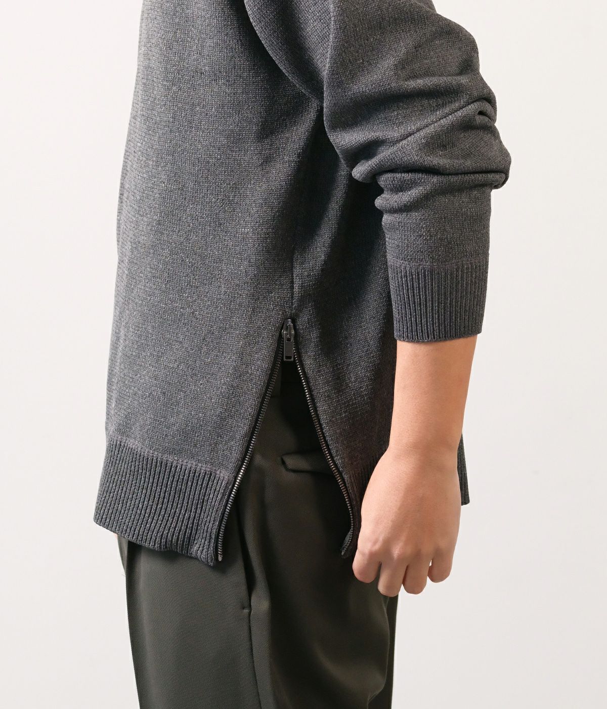 クルーネックの端正さに、ジップスリットというスパイスを加えたロングスリーブニット。
