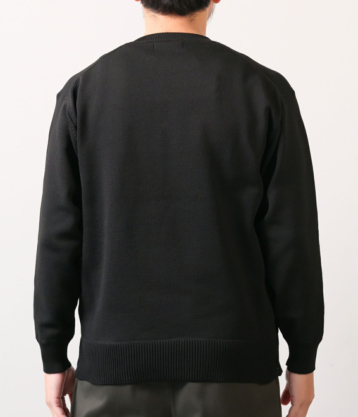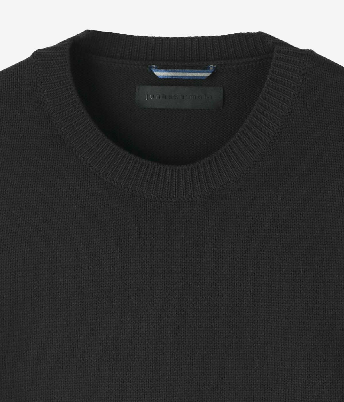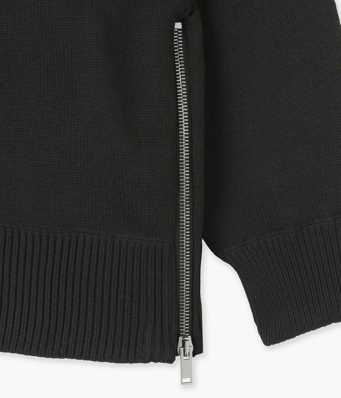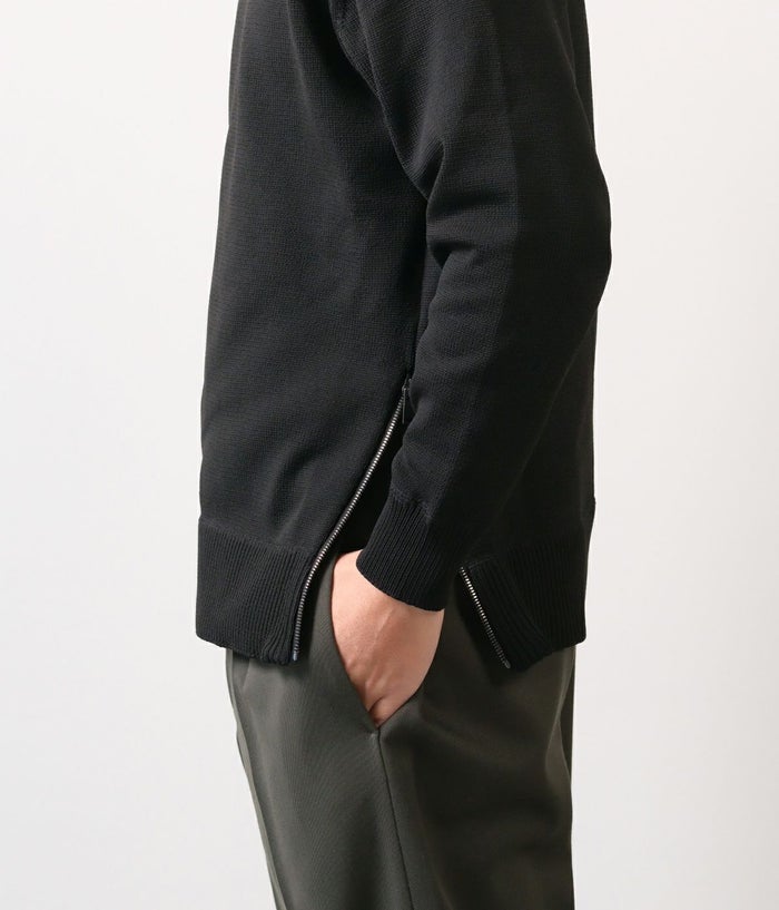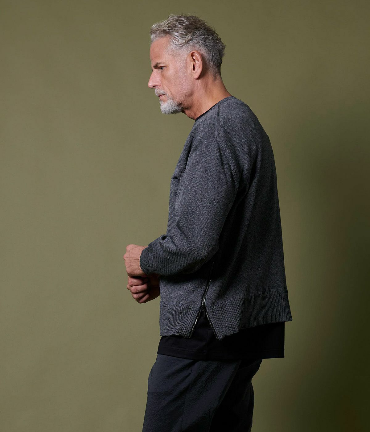 襟はシングルリンキング仕様のクルーネックで、すっきりとした印象に。袖口と裾はリブ編み出しによりフィット感を持たせ、シルエットを引き締めています。両脇には開閉可能なZIPスリットを配置し、動きやすさとレイヤードの幅を確保。さらにアームホール、袖リブ上、裾リブ上には3本針ステッチを施し、さりげないアクセントとして効かせています。ジップにはラッカーニファスナーを採用し、細部まで上質感を追求しました。