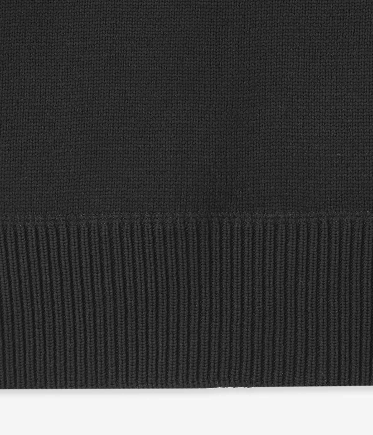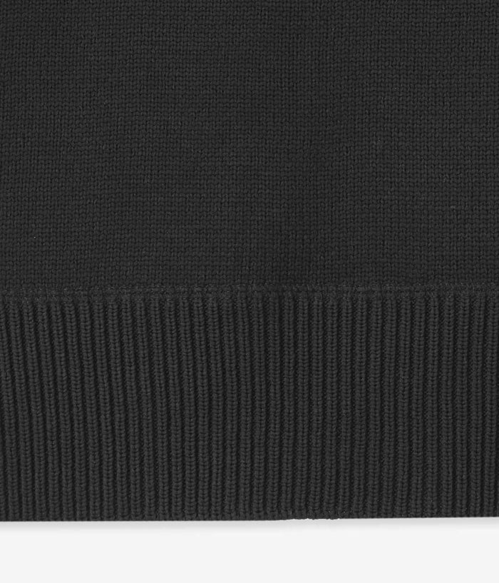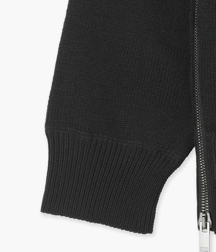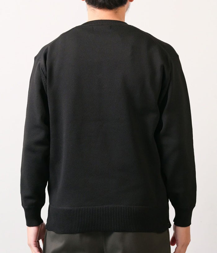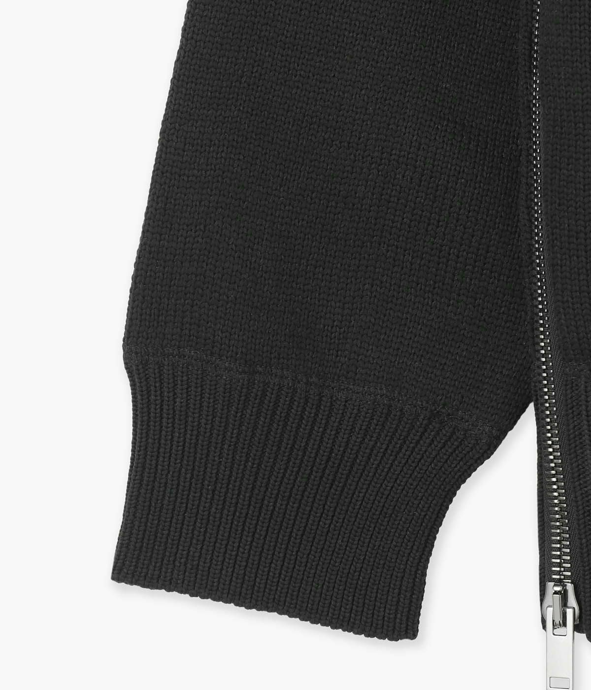 襟はシングルリンキング仕様のクルーネックで、すっきりとした印象に。袖口と裾はリブ編み出しによりフィット感を持たせ、シルエットを引き締めています。両脇には開閉可能なZIPスリットを配置し、動きやすさとレイヤードの幅を確保。さらにアームホール、袖リブ上、裾リブ上には3本針ステッチを施し、さりげないアクセントとして効かせています。ジップにはラッカーニファスナーを採用し、細部まで上質感を追求しました。